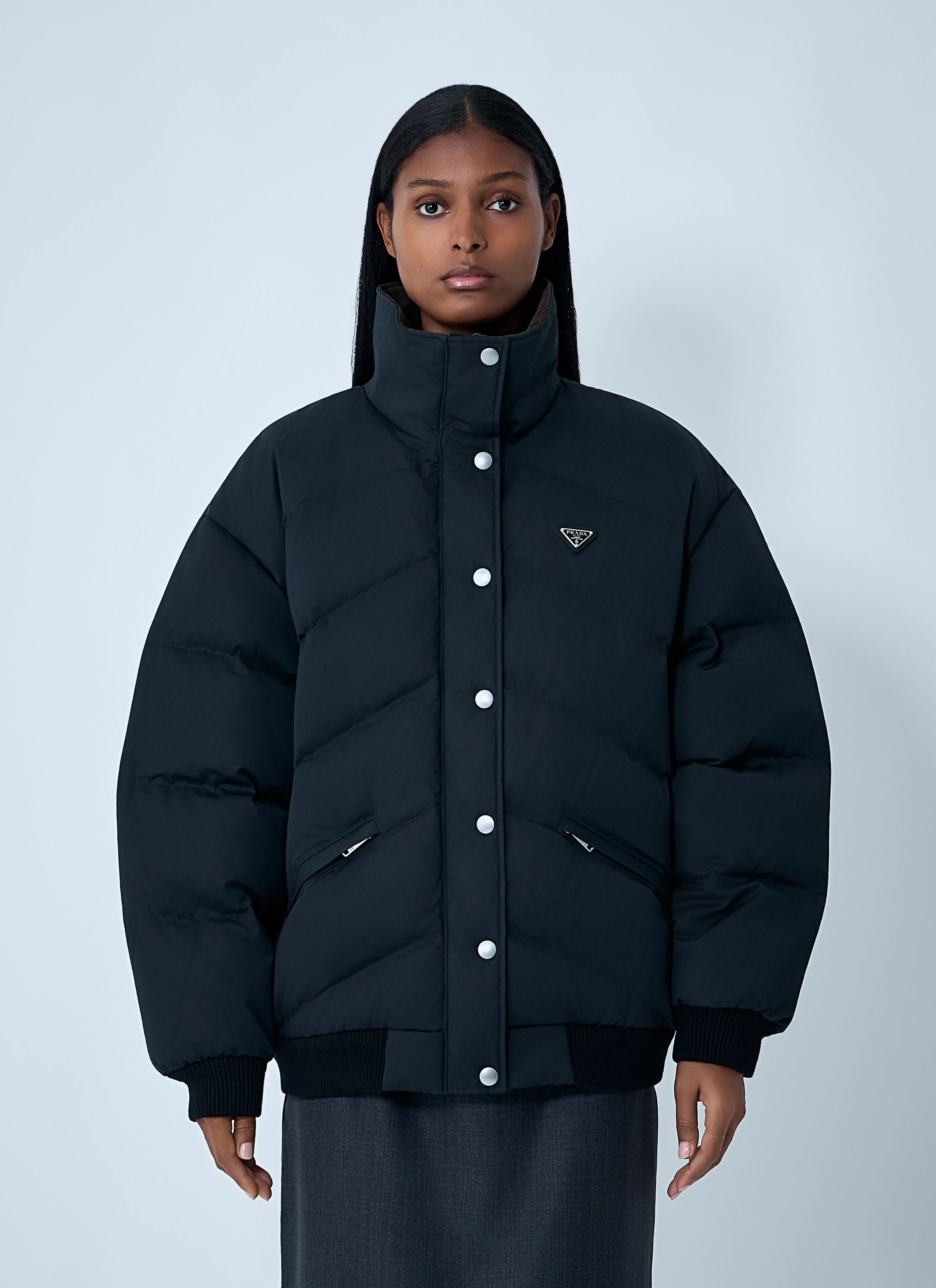 Re-Nylon coat with signature logo motif at chest. - Stand collar - Front zip fastening - Long sleeves - Side slip pockets - Logo motif at chest - Elasticated hem - 85% Cotton, 15% Silk. Fill: 90% Down, 10% Feather. Dry clean - Color: Black - Code: 292295 17IB F0002