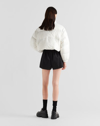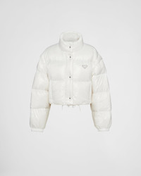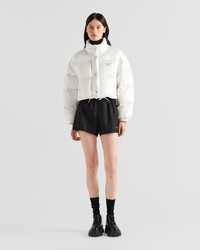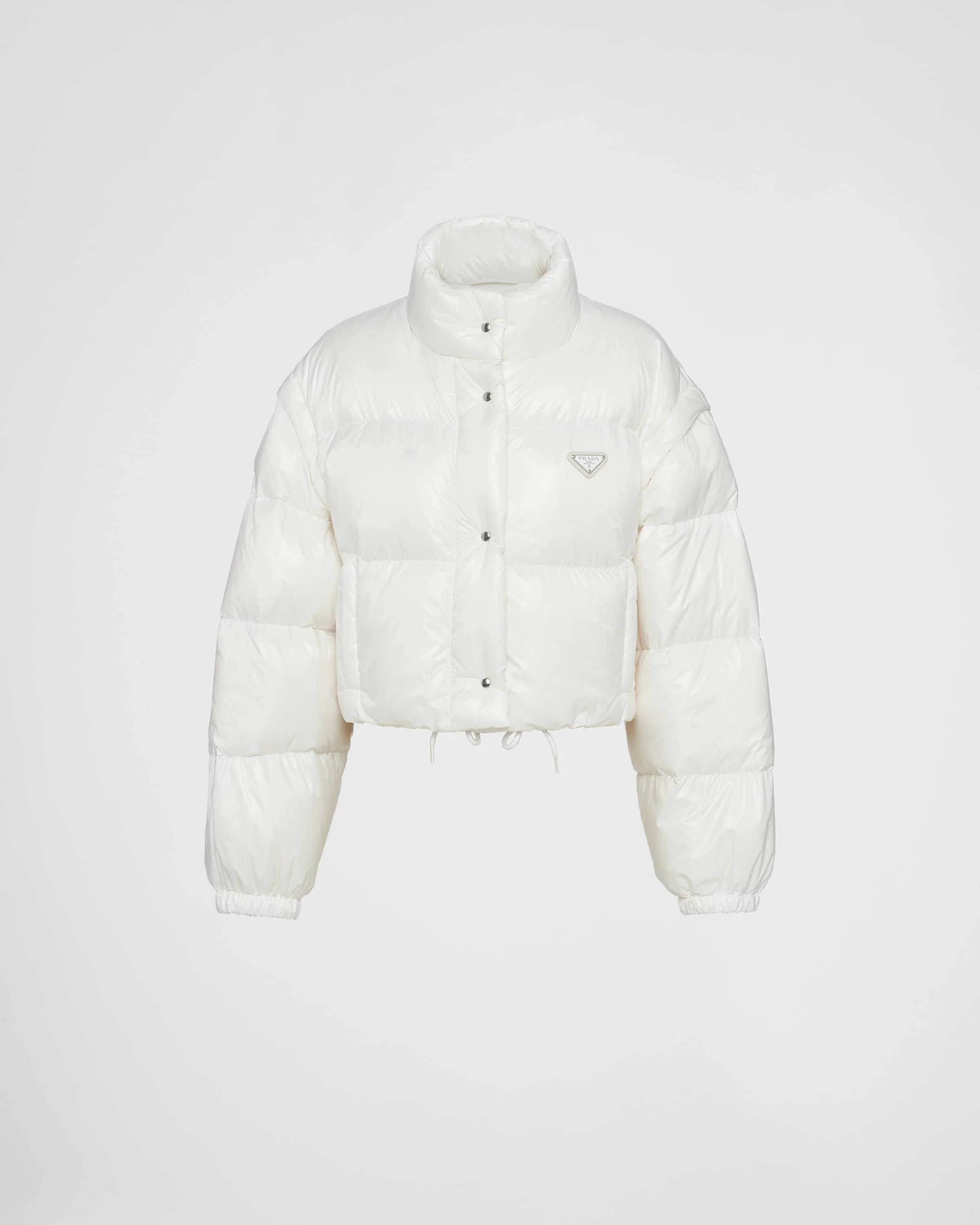 Made of Re-Nylon, the innovative and iconic regenerated nylon fabric produced from recycled and purified plastic materials collected in the ocean, this down jacket is characterized by its cropped fit and reveals its versatile hybrid soul, transforming into a vest thanks to the removable sleeves. Padded with goose down, the garment is decorated with the iconic enameled metal triangle logo. For sustainable care to preserve the product's characteristics and reduce microfiber shedding, we recommend not washing the item too often. Let the product air out after every use and have it dry cleaned at a specialized ecological dry cleaners. - Product code: 291805_11A9_F0009_S_222 - Cropped fit - Goose-down padding - Stand-up collar - Detachable sleeves - Elasticized cuffs - Zipper and snap closure - Welt pockets with zipper - Drawstring hem - Enameled metal triangle logo - Small inner zip pocket - Comfortable regular fit, the garment fits up to one size larger - Imported - The model is 180 cm tall and wears a size 38 Height: 45cm MATERIALS Main material: 100% recycled polyamide