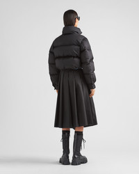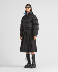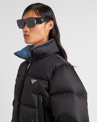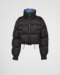 This down jacket with a contemporary design and new cropped cut is made of Re-Nylon, the innovative and iconic regenerated nylon fabric produced from recycled and purified plastic materials collected in the ocean. Padded with goose down, the garment is decorated with the iconic enameled metal triangle logo. For sustainable care to preserve the product's characteristics and reduce microfiber shedding, we recommend not washing the item too often. Let the product air out after every use and have it dry cleaned at a specialized ecological dry cleaners. - Product code: 292056_1WQ8_F0002_S_222 - Cropped fit - Goose down padding - Stand-up collar - Shirt sleeves - Zipper closure - Zipper welt pockets - Fabric drawstring on hem - Enameled metal triangle logo - Cuff with placket and buttons - Regular fit, the garment fits the indicated size - Imported - The model is 180 cm tall and wears a size 38 Height: 45cm MATERIALS Nylon