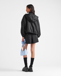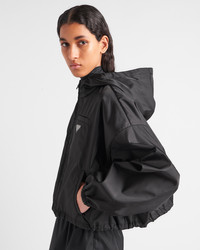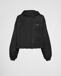 This cropped jacket made of innovative Re-Nylon is inspired by the modern sports world that brings technical garments into the lifestyle look. This boxy style is decorated with the enameled metal triangle logo, an emblematic symbol of the brand since it was first introduced in 1913 on trunks designed by Mario Prada. For sustainable care to preserve the product's characteristics and reduce microfiber shedding, we recommend not washing the item too often. Let the product air out after every use and have it dry cleaned at a specialized ecological dry cleaners. - Product code: 29X900_1WQ8_F0002_S_202 - Unlined - Long sleeves - Elasticized cuffs - Zipper closure - Welt pockets - Enameled metal triangle logo - Elasticized drawstring hem - Front welt pocket with hook-and-loop fastener - Elastic drawstring hood - Comfortable regular fit, the garment fits up to one size larger - Imported - The model is 175 cm tall and wears a size 38 Height: 45cm MATERIALS Main material: 100% recycled polyamide