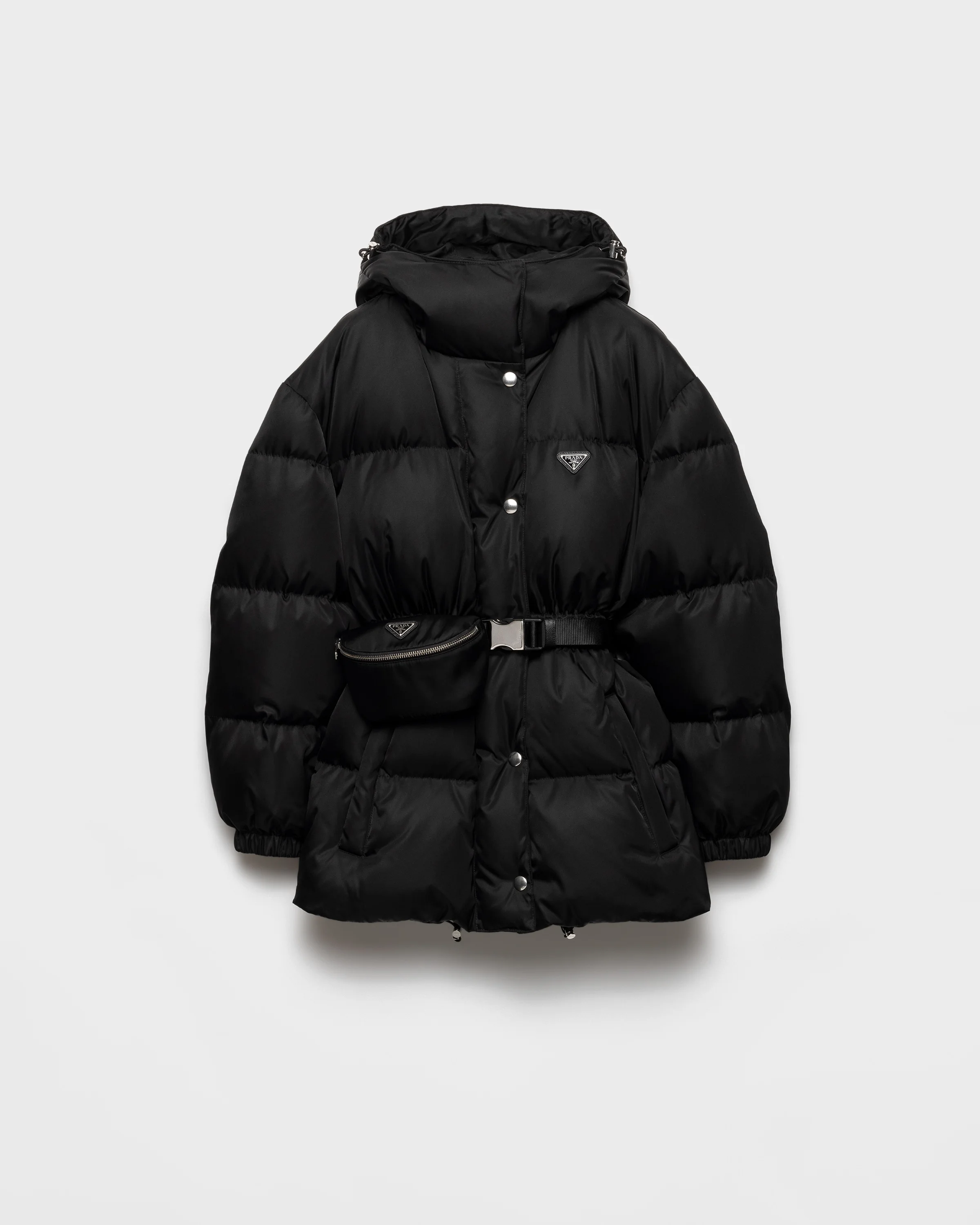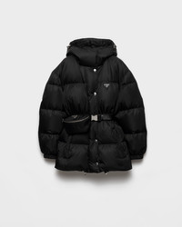 This Re-Nylon down jacket with goose down padding combines performance and an aesthetic identity. The structured hood and integrated pouch complete its functionality. For sustainable care to preserve the product's characteristics and reduce microfiber shedding, we recommend not washing the item too often. Let the product air out after every use and have it dry cleaned at a specialized ecological dry cleaners. - Product code: 29X966_1WQ8_F0002_S_OOO - Medium-weight - Goose down padding - Long sleeves - Elasticized cuff - Zipper and snap closure - Welt zipper pocket - Elasticized drawstring hem - Hood with flap that closes with a Re-Nylon strap and buckle - Internal vertical welt zipper pocket on the left - Enameled metal triangle logo on the garment and pouch - Garment with front pouch - Imported - The model is 178 cm tall and wears a size 38 Height: 72cm MATERIALS Main material: 100% recycled polyamide