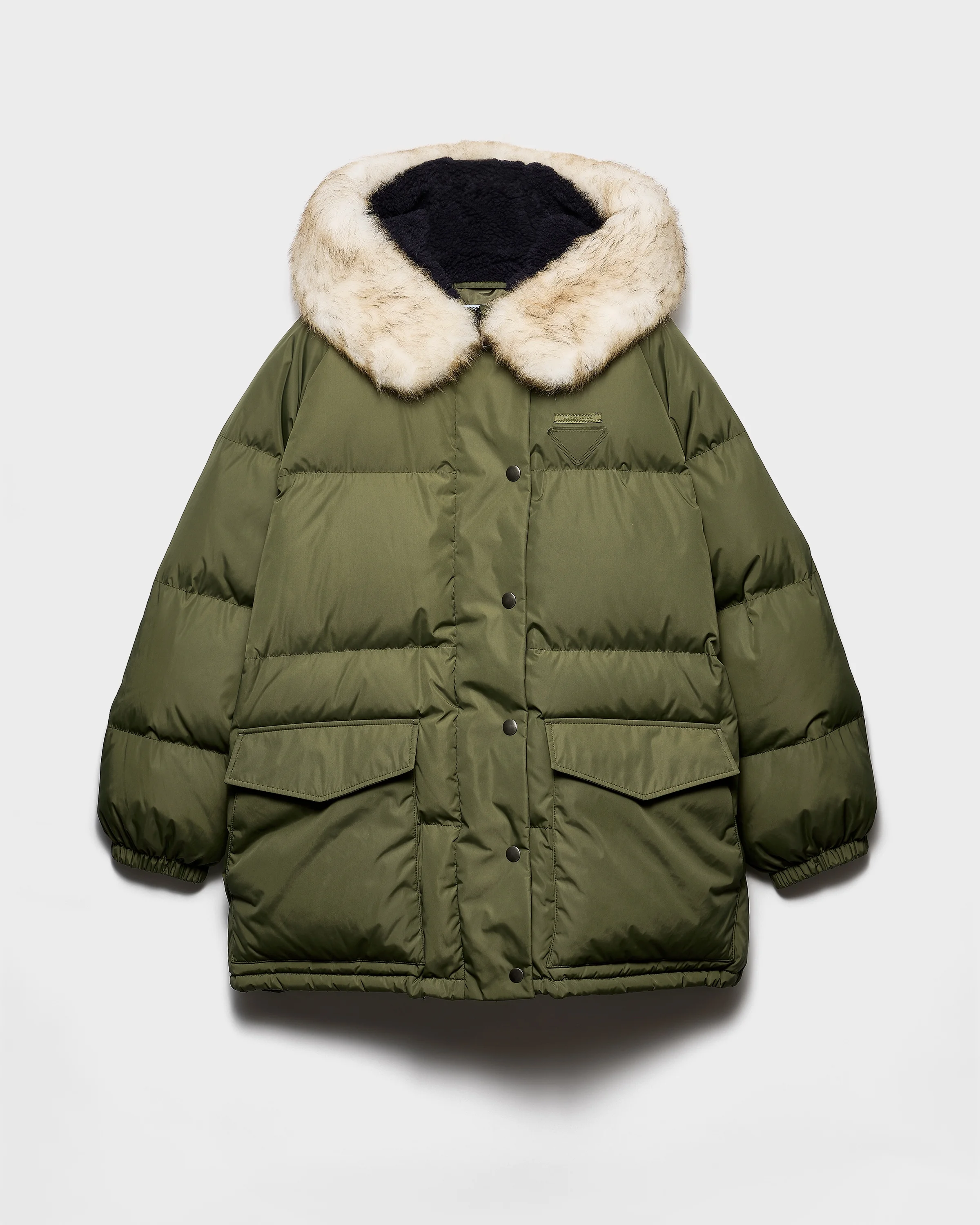 Ample, oversized volumes characterize this warm, enveloping garment for winter that combines sophistication and functionality. The down jacket made of Re-Nylon is completed with a shearling-trimmed hood. - Product code: 29Z334_17PM_F0161_S_OOO - Eco-feather padding - Hooded collar - Long sleeves - Elasticized cuff - Zipper and snap closure - Patch pockets - Elasticized drawstring hem - Fabric triangle logo and sartorial logo label - Fleece-lined hood with shearling trim - Imported - The model is 180 cm tall and wears a size 38 Height: 80cm MATERIALS Main material: 100% recycled polyamide