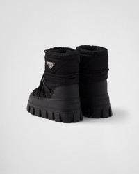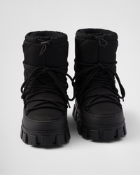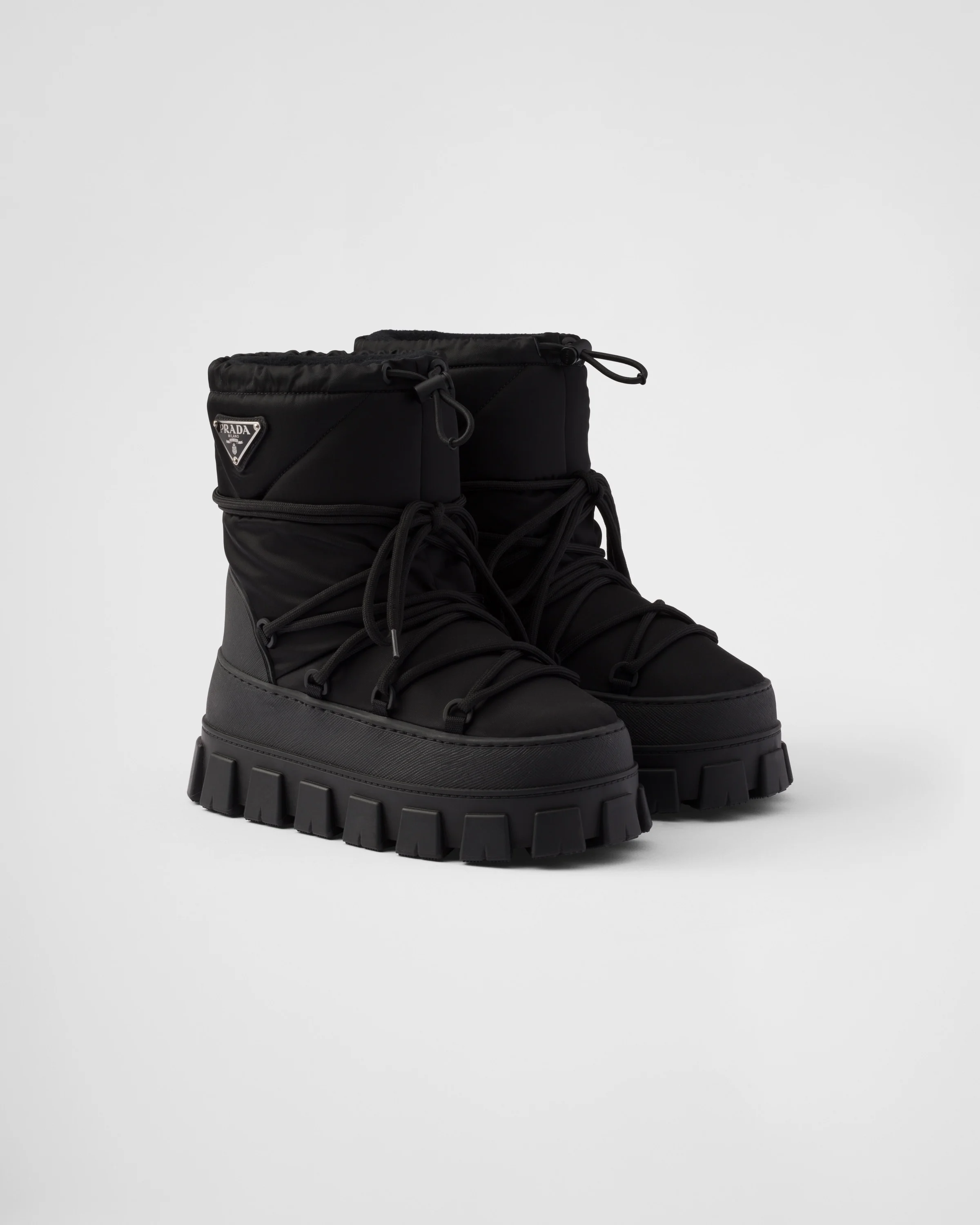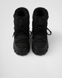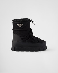 These Re-Nylon gabardine apres-ski boots with a sporty design and technical details have a fleece lining and rubber soles characterized by the distinctive lug tread. This product does not contribute to the SEA BEYOND educational program. - Product code: 1U007N_3LFV_F0002_F_G040 - Drawstring upper - Padded fleece lining, removable - Enameled metal triangle logo - Tubular laces closure - Boot leg, 20 cm - Rubber sole, 40 mm - Lug tread - Imported MATERIALS Main material: Recycled polyamide