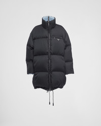 This hooded down coat with oversized silhouette emphasized by the belt with metal buckle cinching the waist is made of Re-Nylon, the innovative and iconic regenerated nylon fabric produced from recycled and purified plastic materials collected in the ocean. Padded with goose down, the garment is decorated with the iconic enameled metal triangle logo. For sustainable care to preserve the product's characteristics and reduce microfiber shedding, we recommend not washing the item too often. Let the product air out after every use and have it dry cleaned at a specialized ecological dry cleaners. - Product code: 29Z408_11C9_F0002_S_222 - Down coat - Goose down padding - Stand-up collar - Long sleeves - Straight cuff - Zipper closure - Zipper pockets - Elasticized drawstring on hem - Enameled metal triangle logo - Elasticized belt with metal buckle - Small zipper welt pocket - Small inner zipper pockets - Comfortable regular fit, the garment fits up to one size larger - Imported - The model is 180 cm tall and wears a size 38 Height: 88cm MATERIALS Main material: 100% recycled polyamide