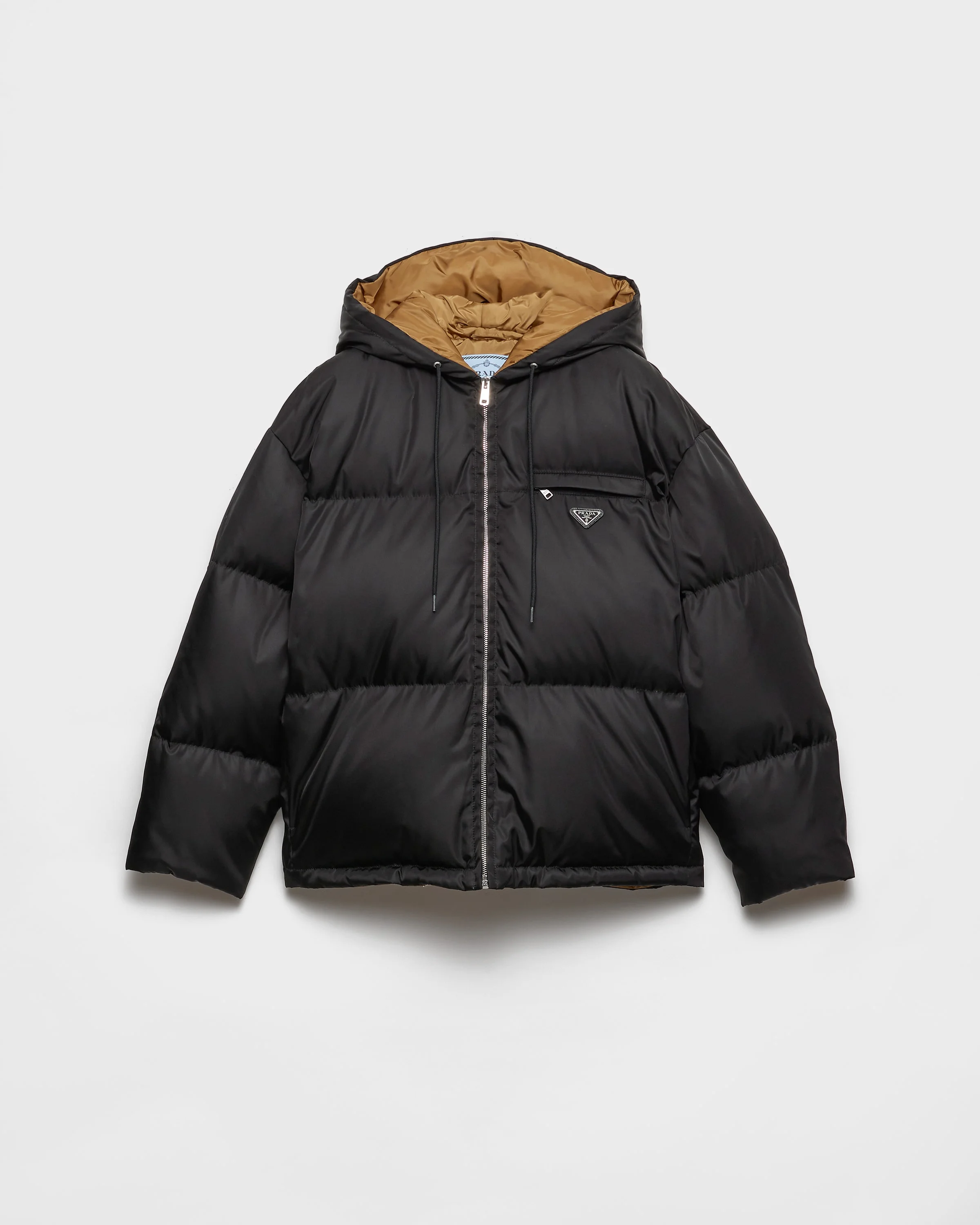 Contemporary volumes define this down jacket with a simple design made of Re-Nylon with goose down padding. Sporty and functional details complete the distinctive garment decorated with the enameled metal triangle logo. For sustainable care to preserve the product's characteristics and reduce microfiber shedding, we recommend not washing the item too often. Let the product air out after every use and have it dry cleaned at a specialized ecological dry cleaners. - Product code: 29B408_1WQ8_F0002_S_AAO - Regular fit - Goose down padding - Drawstring hood - Long sleeves - Zipper closure - Zipper pockets - Enameled metal triangle logo - Internal zipper pockets - Elasticized drawstring hem - Back zipper pocket - Imported - The model is 180 cm tall and wears a size 38 Height: 66cm MATERIALS Main material: 100% recycled polyamide
