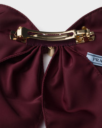 This bow hair clip is made of Re-Nylon, the innovative regenerated nylon fabric distinctive of Prada collections. The accessory with elegant allure is embellished with the iconic enameled metal triangle logo. For sustainable care to preserve the product's characteristics and reduce microfiber shedding, we recommend not washing the item too often. Let the product air out after every use and have it dry cleaned at a specialized ecological dry cleaners. - Product code: 1IF163_2DMI_F0GCM - Metal clip on the back - Enameled metal triangle logo - Imported Height: 9cm Width: 18cm MATERIALS Main material: Recycled polyamide