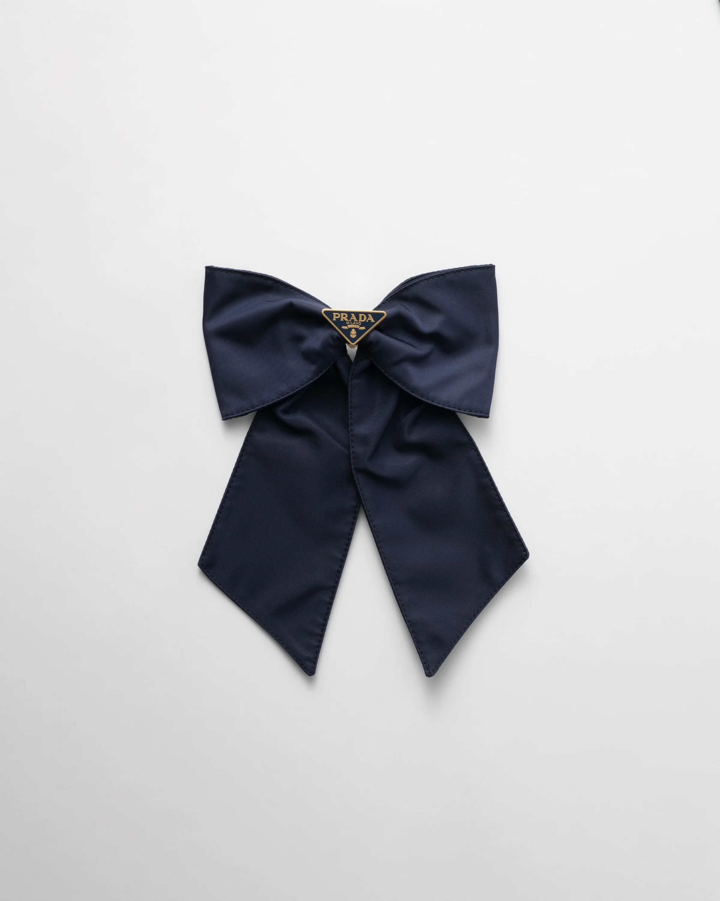 This bow hair clip is made of Re-Nylon, the innovative regenerated nylon fabric distinctive of Prada collections. The accessory with elegant allure is embellished with the iconic enameled metal triangle logo. For sustainable care to preserve the product's characteristics and reduce microfiber shedding, we recommend not washing the item too often. Let the product air out after every use and have it dry cleaned at a specialized ecological dry cleaners. - Product code: 1IF163_2DMI_F0DMH - Metal clip on the back - Enameled metal triangle logo - Imported Height: 9cm Width: 18cm MATERIALS Main material: Recycled polyamide