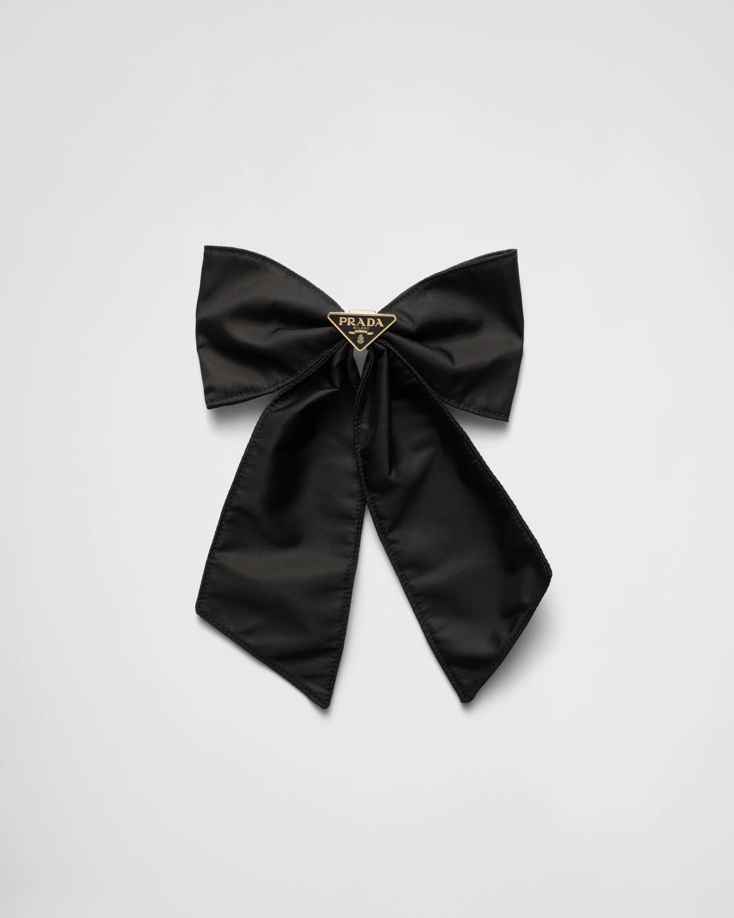 This bow hair clip is made of Re-Nylon, the innovative regenerated nylon fabric distinctive of Prada collections. The accessory with elegant allure is embellished with the iconic enameled metal triangle logo. For sustainable care to preserve the product's characteristics and reduce microfiber shedding, we recommend not washing the item too often. Let the product air out after every use and have it dry cleaned at a specialized ecological dry cleaners. - Product code: 1IF163_2DMI_F0632 - Metal clip on the back - Enameled metal triangle logo - Imported Height: 9cm Width: 18cm MATERIALS Main material: Recycled polyamide