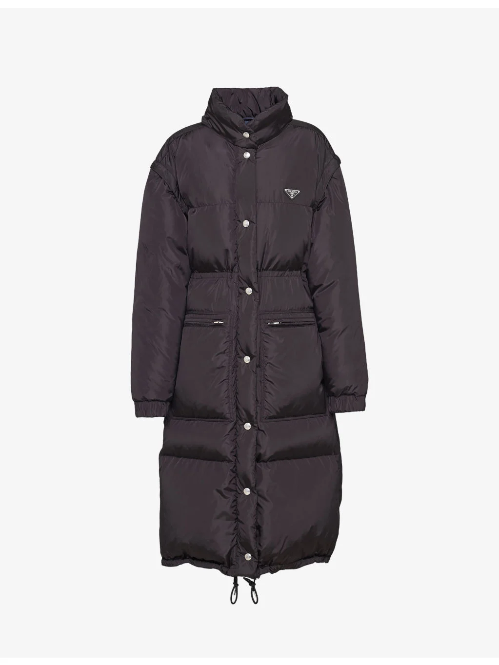 PRODUCT DETAILS - Pradadown coat - 100% polyamide: filling 100% goose-down padding - Zip fastening - Long coat silhouette, goose down padding, ring collar, elastic cuffs, zip and snap closure, drawstring on hem and hood, enamelled metal triangle logo, stowaway hood in the collar with snap, elasticated drawstring waist, detachable zipper sleeves, logo-engraved snaps, zip patch pockets, side entry under the patch pockets - Dry clean - True to size - Model is 5ft 10in/1.78m and wears a size UK 8 - Midweight, non-stretch Ref: R04494612