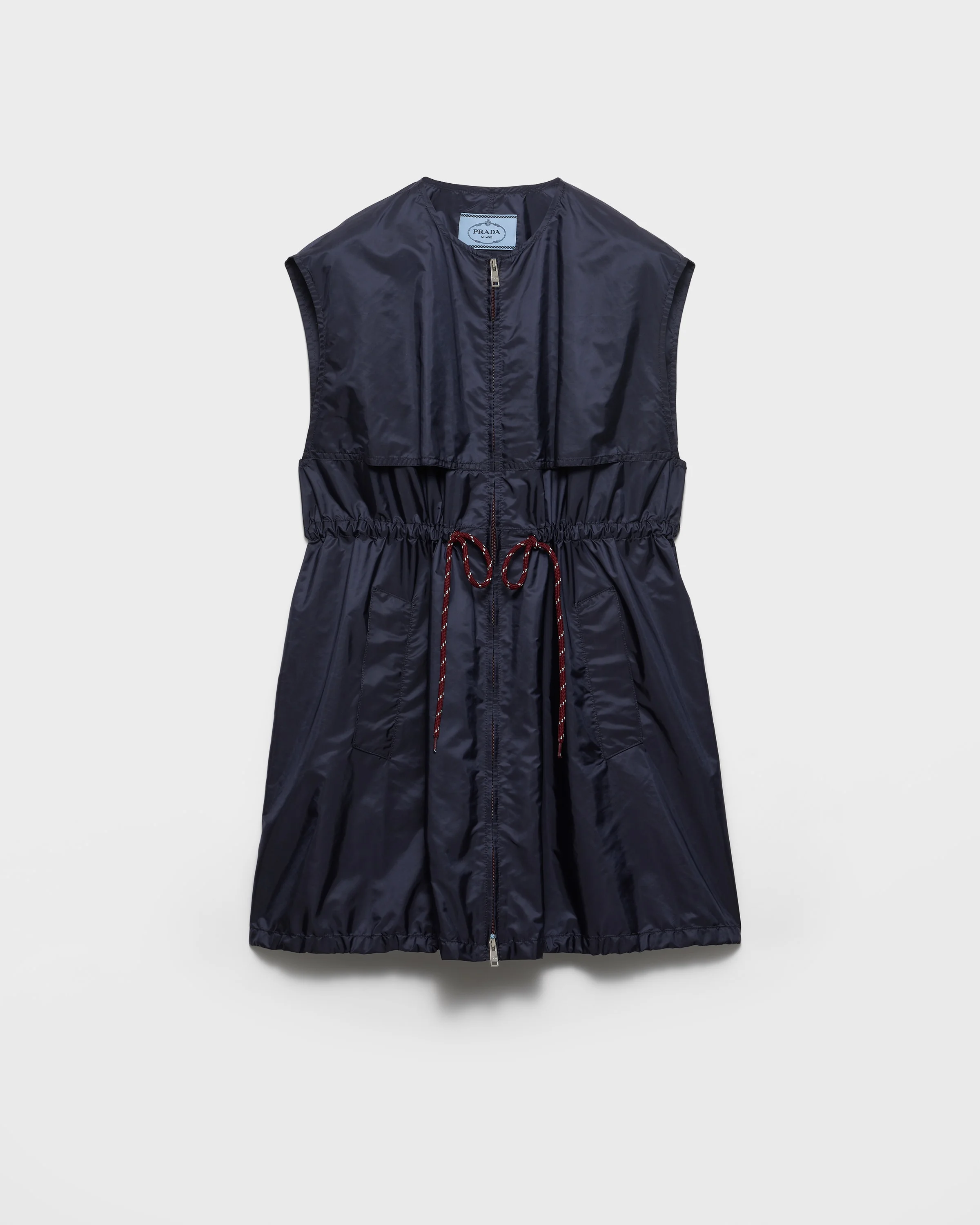 Sporty details and light volumes define this mini-dress made of regenerated nylon and characterized by a contemporary design that combines novel details and iconic elements. For sustainable care to preserve the product's characteristics and reduce microfiber shedding, we recommend not washing the item too often. Let the product air out after every use and follow the washing instructions on the label. - Product code: 230730_1WQ9_F0AA7_S_WM1 - Loose fit - Unlined garment - Round neck - Front zipper closure - Wide welt pockets - Metal logo - Drawstring waist - Fabric drawstring on hem - Front and back yoke - Imported - The model is 178 cm tall and wears a size 38 Height: 90cm MATERIALS Main material: 100% Recycled Polyamide