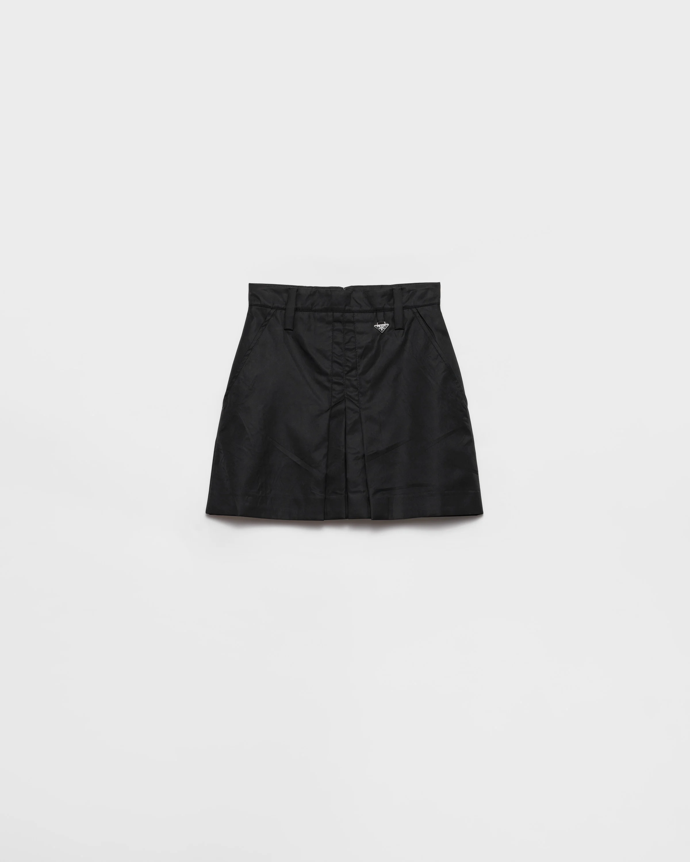 This Re-Nylon miniskirt with hybrid style combines feminine allure with the functional, sporty character of regenerated nylon. The style with pleats on the front and back is decorated with the iconic enameled metal triangle logo. For sustainable care to preserve the product's characteristics and reduce microfiber shedding, we recommend not washing the item too often. Let the product air out after every use and have it dry cleaned at a specialized ecological dry cleaners. - Product code: 21Y009_1WQ8_F0002_S_OOO - Lined garment - Zipper closure - Enameled metal triangle logo - Angled slash pockets - Waistband with belt loops - Front and back pleats - Pressed garment - Imported - The model is 180 cm tall and wears a size 38 MATERIALS Main material: 100% recycled polyamide