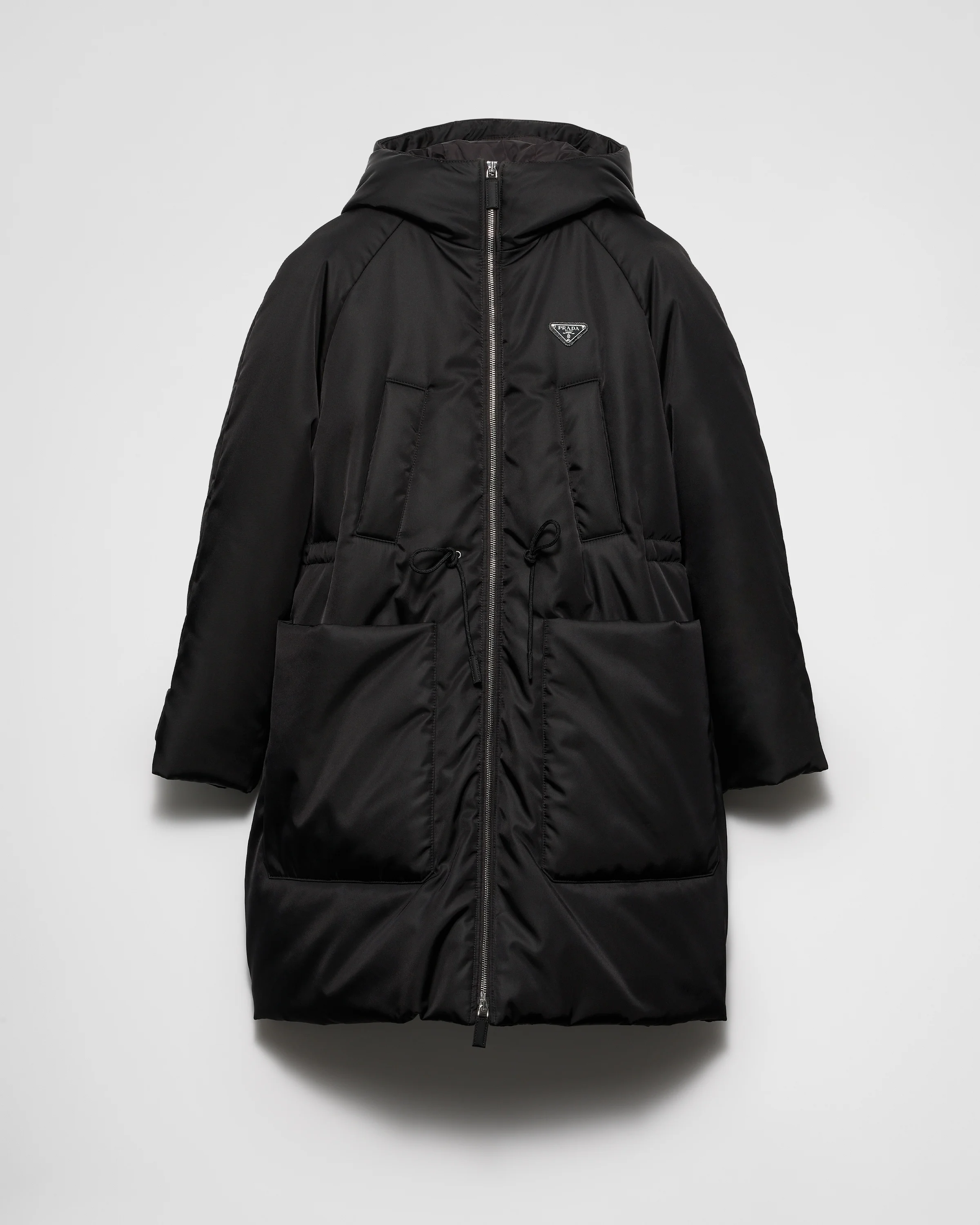 This Re-Nylon down coat with a functional character and refined details is characterized by the long, enveloping silhouette decorated with the iconic triangle logo. For sustainable care to preserve the product's characteristics and reduce microfiber shedding, we recommend not washing the item too often. Let the product air out after every use and have it dry cleaned at a specialized ecological dry cleaners. - Product code: 292197_1WQ8_F0002_S_OOO - Goose down padding - Collar with hood - Long sleeves - Cuff with buttons - Zipper closure - Patch pockets - Enameled metal triangle logo - Lined garment - Drawstring at the waist - Welt pockets on the chest - Relaxed fit: the garment fits up to two sizes larger - Imported - The model is 178 cm tall and wears a size 38 Height: 95cm MATERIALS Main material: 100% recycled polyamide