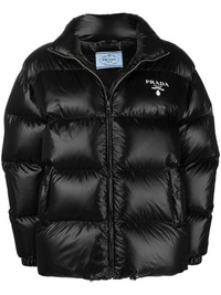 Re-Nylon puffer jacket Crafted from Re-Nylon, Prada's recycled nylon fabric, this puffer jacket cuts an oversized silhouette. The design finds its warmth through its duck feather filling and is finished with a contrasting logo print at the chest. Composition Outer: Recycled Polyamide 100% Lining: Recycled Polyamide 100%, Duck Feathers 100% SIZE & FIT Model measurements Height 5 ft 10 in(1.78 m) Bust/Chest 33.07 in(84 cm) Hips 35.82 in(91 cm) Waist 25.98 in(66 cm) FittingInformation This piece fits true to size. We recommend you get your regular size Cut for a loose fit Made with a mid-weight non-stretch fabric