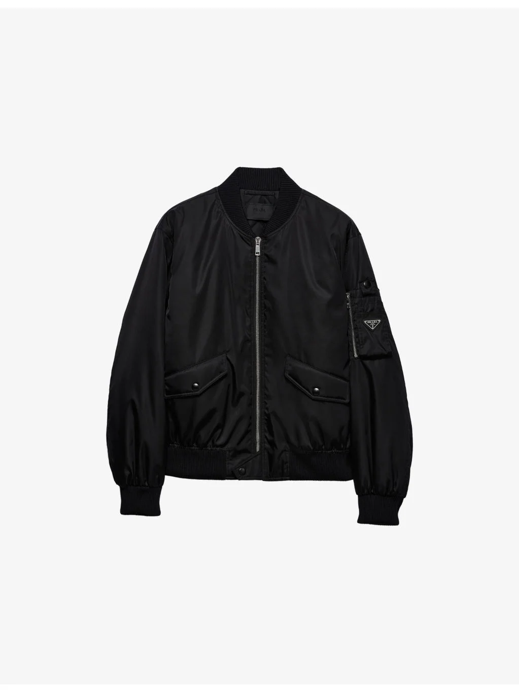 PRODUCT DETAILS - Prada shell bomber jacket - 100% polyamide - Exposed zip fastening at front - Relaxed fit, ribbed collar, long sleeves, dropped shoulders, enamelled metal triangle logo on the front, zipped triangle pocket with logo at sleeves, two buttoned flap pockets at front, padded and lined, ribbed trims - Made in Italy - Model is 6ft 1in/1.85m and wears a size medium - Midweight, non-stretch - Please note, we are unable to accept in-store returns on Prada orders Ref: R04461369