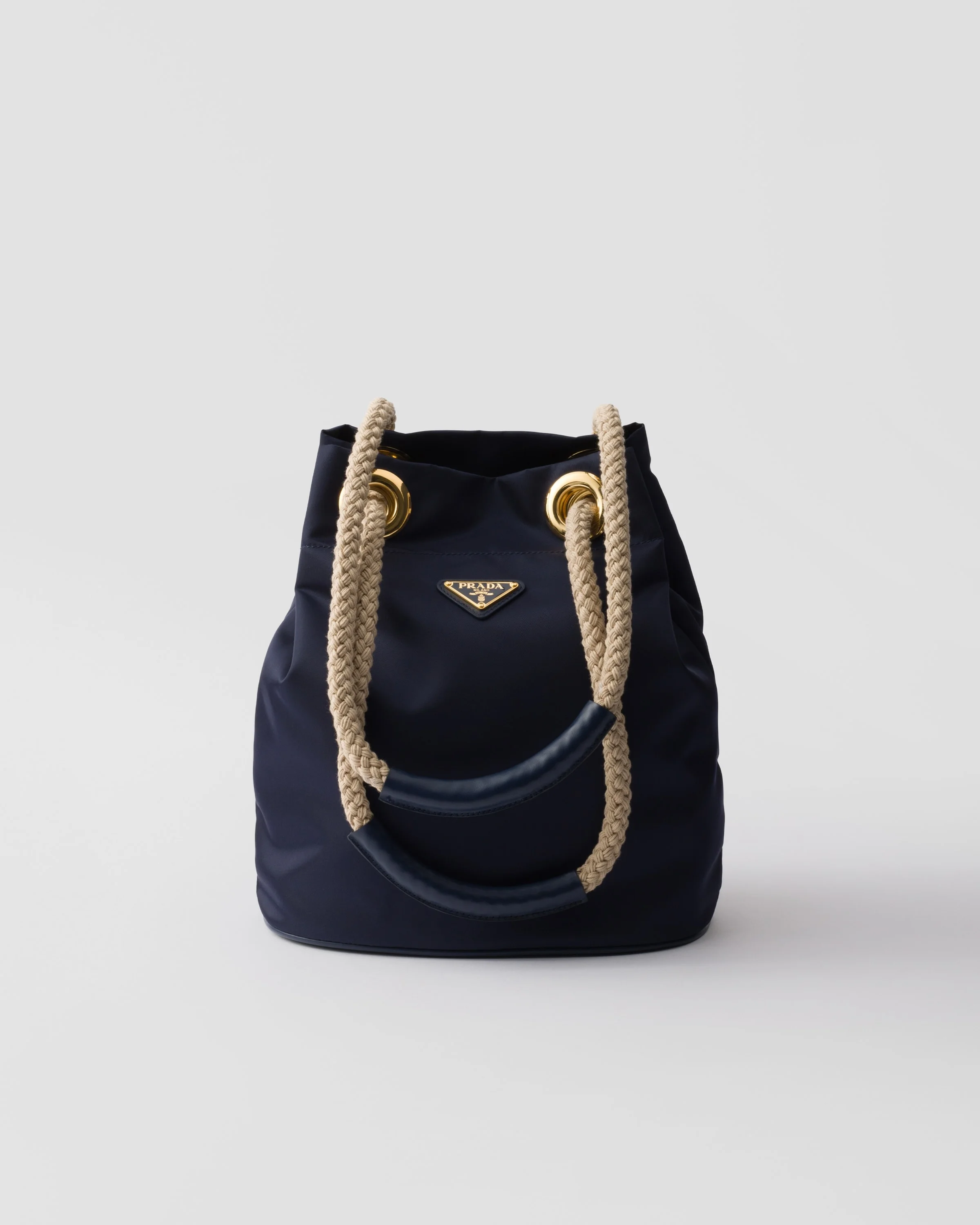 Unusual combinations animate this Re-Nylon bag inspired by the timeless codes of nautical style. Sliding cord handles underline the versatile character of the accessory that can be worn carried by hand or over the shoulder, completed by the enameled metal triangle logo. For sustainable care to preserve the product's characteristics and reduce microfiber shedding, we recommend not washing the item too often. Let the product air out after every use and have it dry cleaned at a specialized ecological dry cleaners. - Product code: 1BE082_2HG8_F0216_V_OOO - Sliding cord and leather handles, drop from 23 to 50 cm - Metal hardware - Enameled metal triangle logo on the front - Logo-print Re-Nylon interior with zipper pocket - Imported Height: 28cm Width: 23.5cm Length: 16.5cm MATERIALS Main material: Recycled polyamide