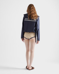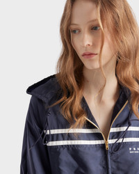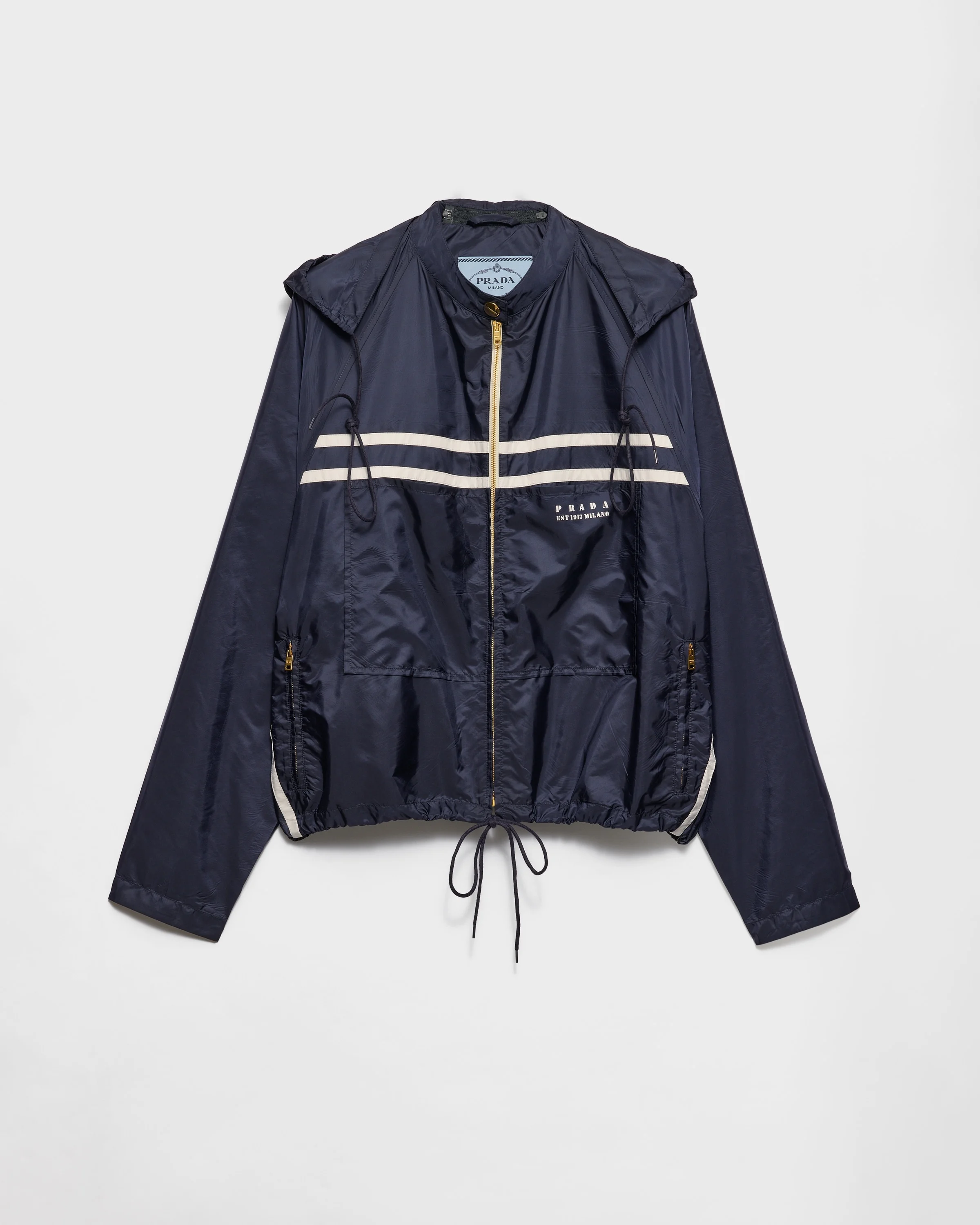 Techwear inspired this blouson jacket with minimalist lines made of Re-Nylon. The light, versatile silhouette is animated by graphic contrasts that underline the clean lines of the design. For sustainable care to preserve the product's characteristics and reduce microfiber shedding, we recommend not washing the item too often. Let the product air out after every use and have it dry cleaned at a specialized ecological dry cleaners. - Product code: 29M283_1WQ9_F0AA7_S_OOO - Unlined garment - Stand-up collar - With hood - Long sleeves - Buttoned cuffs - Zipper closure - Welt zipper pockets - Printed logo - Contrasting bands - Pressed garment - Imported - The model is 176 cm tall and wears a size 38 Height: 60cm MATERIALS Main material: 100% recycled polyamide