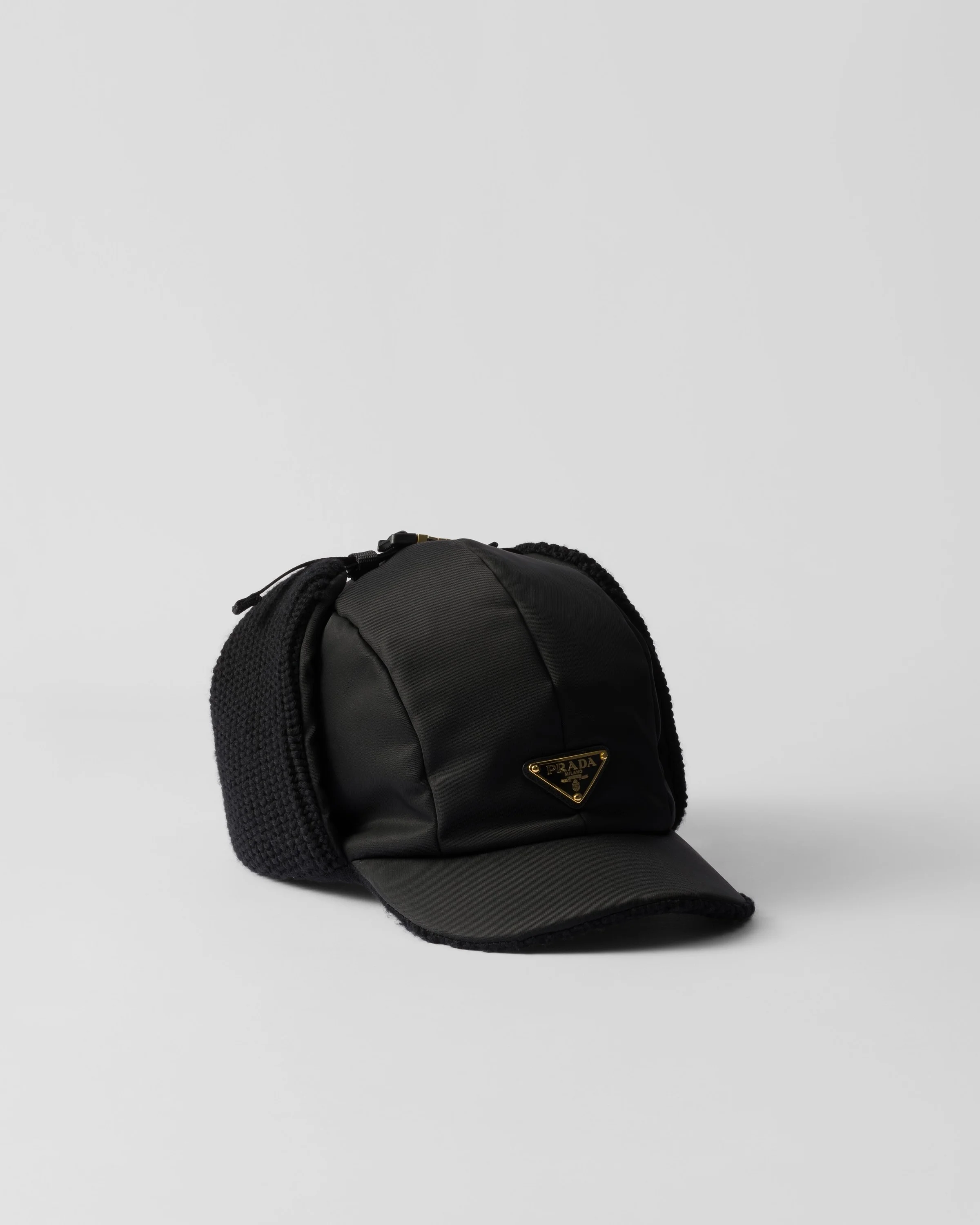 The versatile, sporty design of this trapper hat in Re-Nylon, Prada's emblematic regenerated nylon fabric, is completed with wool details and decorated with the triangle logo. This product does not contribute to the SEA BEYOND educational program. - Product code: 1HC392_2DZK_F0002 - Enameled metal triangle logo - Imported MATERIALS Main material: Recycled polyamide