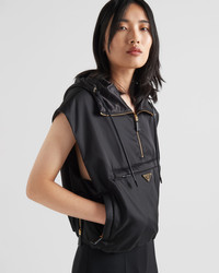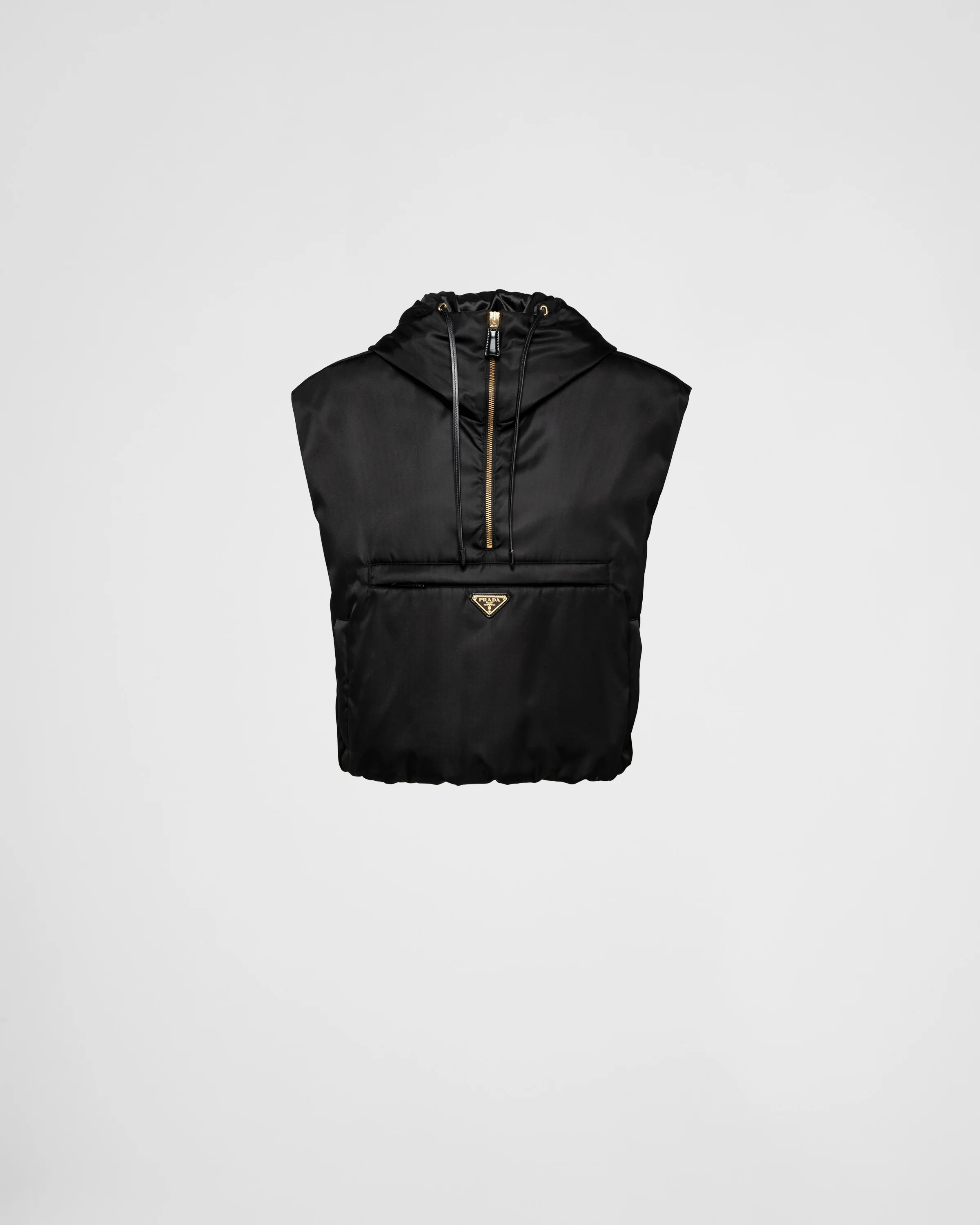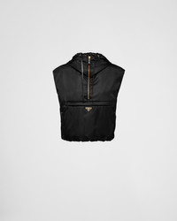 Enveloping lines and light volumes define the silhouette of this vest made of Re-Nylon, the innovative regenerated nylon yarn produced from recycled and purified plastic materials collected in the ocean. Combining sophistication and versatility, the padded design with hood is characterized by functional details and is embellished with the iconic enameled metal triangle logo. For sustainable care to preserve the product's characteristics and reduce microfiber shedding, we recommend not washing the item too often. Let the product air out after every use and have it dry cleaned at a specialized ecological dry cleaners. - Product code: 29M097_1WQ8_F0002_S_232 - Padded lining - Hooded - Zipper closure - Welt zipper pockets - Enameled metal triangle logo - Elasticized drawstring hem - Additional horizontal welt zipper pocket - Zipper opening on the side - Logo-print leather zipper pulls - Leather drawstring on hood - Regular fit, the garment fits the indicated size - Imported Height: 50cm MATERIALS Main material: 100% recycled polyamide