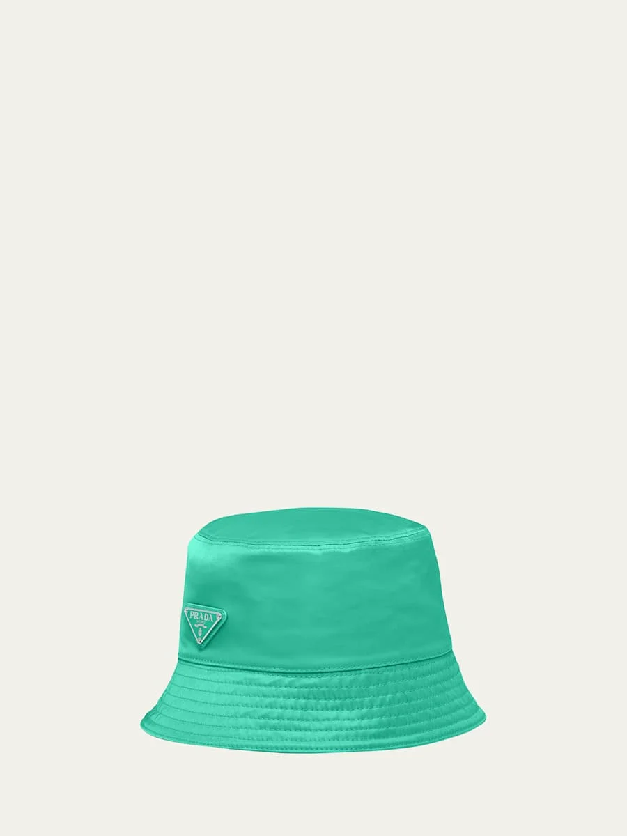 Prada bucket hat. Features enameled metal triangle logo. Flat crown. Downturned brim. Recycled nylon. Lining, cotton. Made in Italy. Online Inquiries: BGS21_D4MZX| Store Inquiries: #4037144