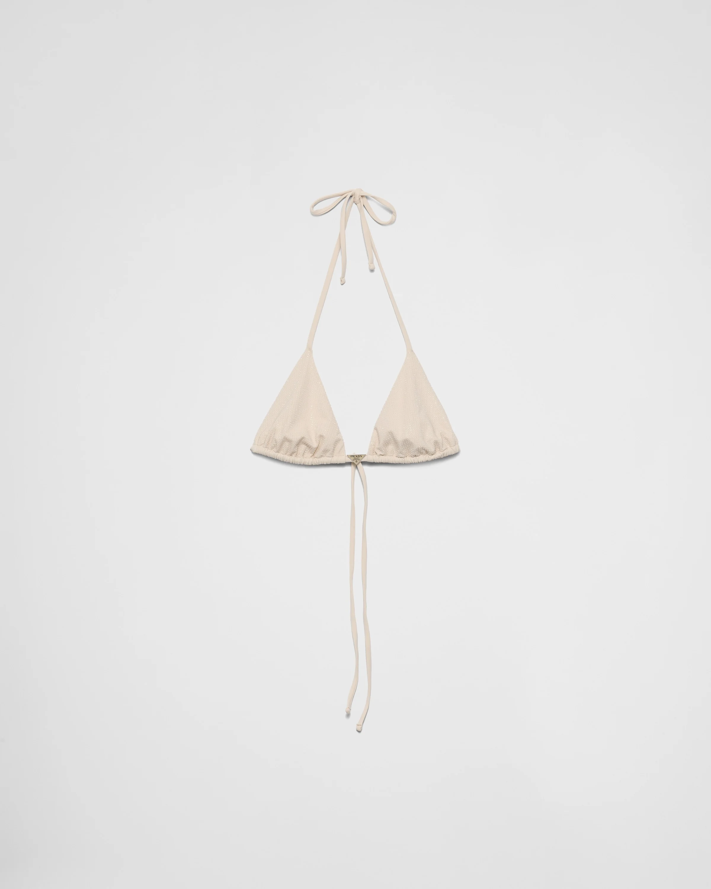 This bikini top with refined, contemporary allure has a sleek triangle design with spaghetti strap halter neck and features sparkling tonal rhinestones. The enameled metal triangle logo enhances the style with an iconic note. For sustainable care to preserve the product's characteristics and reduce microfiber shedding, we recommend not washing the item too often. Let the product air out after every use and have it dry cleaned at a specialized ecological dry cleaners. - Product code: 70209R_13K9_F03OP_S_231 - Lined triangle bra top - Hook closure - Spaghetti strap halter neckline - Enameled metal triangle logo - All-over rhinestone embellishment - Imported - The model is 179 cm tall and wears a size 38 MATERIALS Main material: 18% elastane 82% recycled polyamide