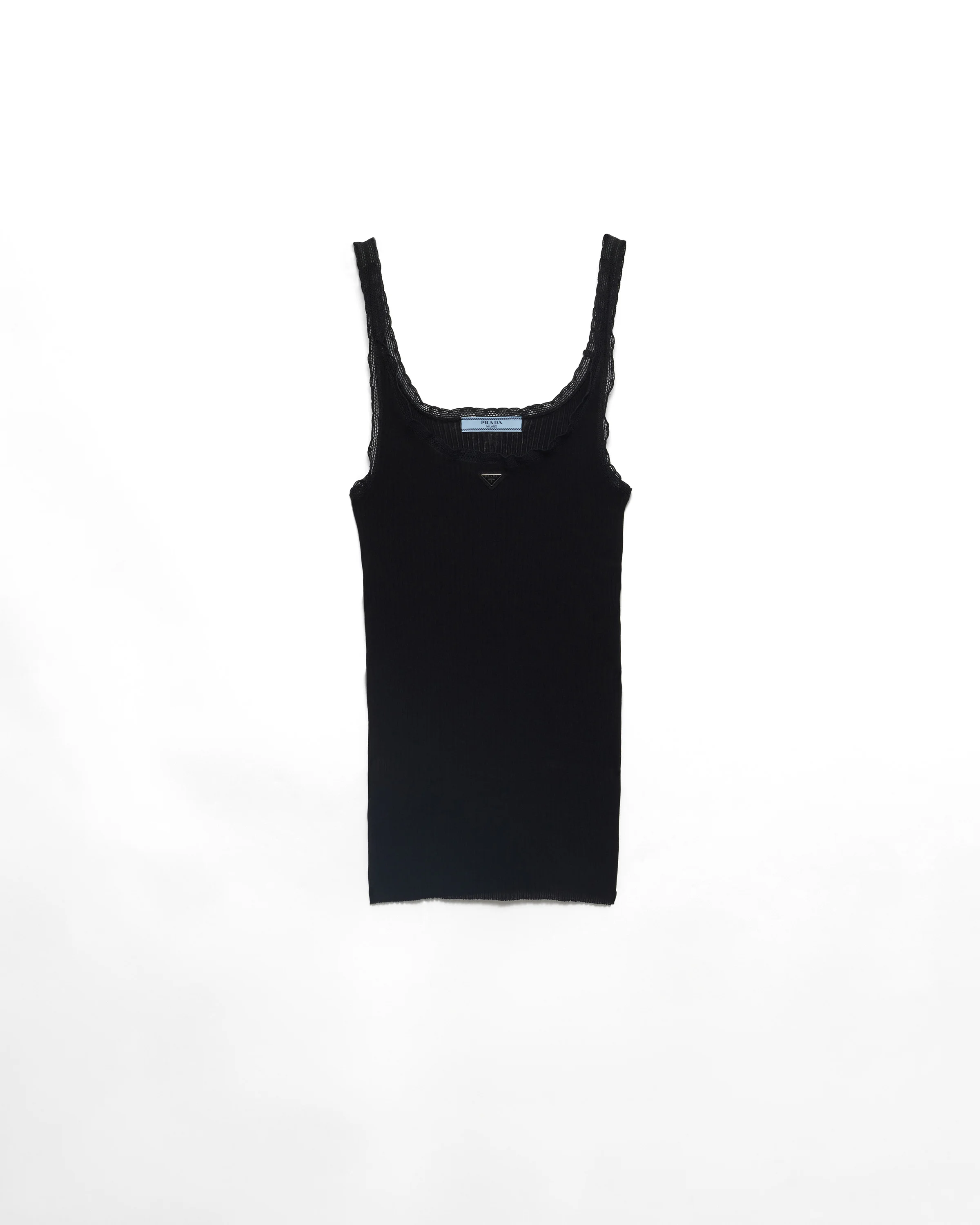 Ribbed knit enriches the texture of this light top made of stretch cotton and decorated with lace trim. The delicate style defined by a scoop neck and spaghetti straps is decorated with the iconic triangle logo. - Product code: P29B82_17LA_F0002_S_OOO - Ribbed knit - Slim fit - Scoop neck - Enameled metal triangle logo - Lace trim on the neckline and shoulder straps - Imported - The model is 178 cm tall and wears a size 38 Height: 62cm MATERIALS Main material: 100% cotton