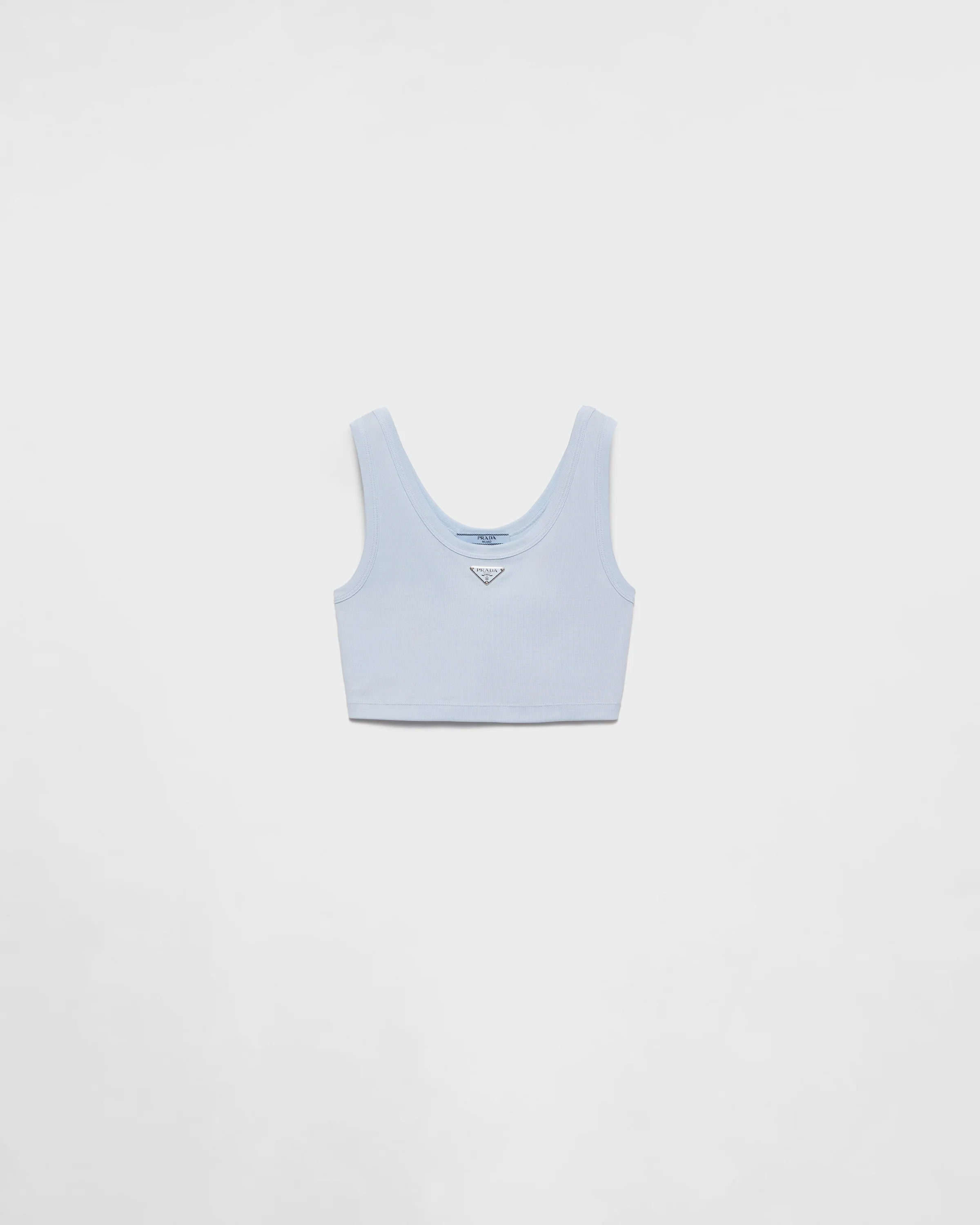 This ribbed cotton top has a slim-fit cropped design. The simple style with scoop neck is embellished with the iconic enameled metal triangle logo. - Product code: 39576_14L0_F0012_S_OOO - Fitted - Scoop neck - Enameled metal triangle logo - Imported - The model is 178 cm tall and wears a size 38 Height: 33cm MATERIALS Main material: 100% cotton