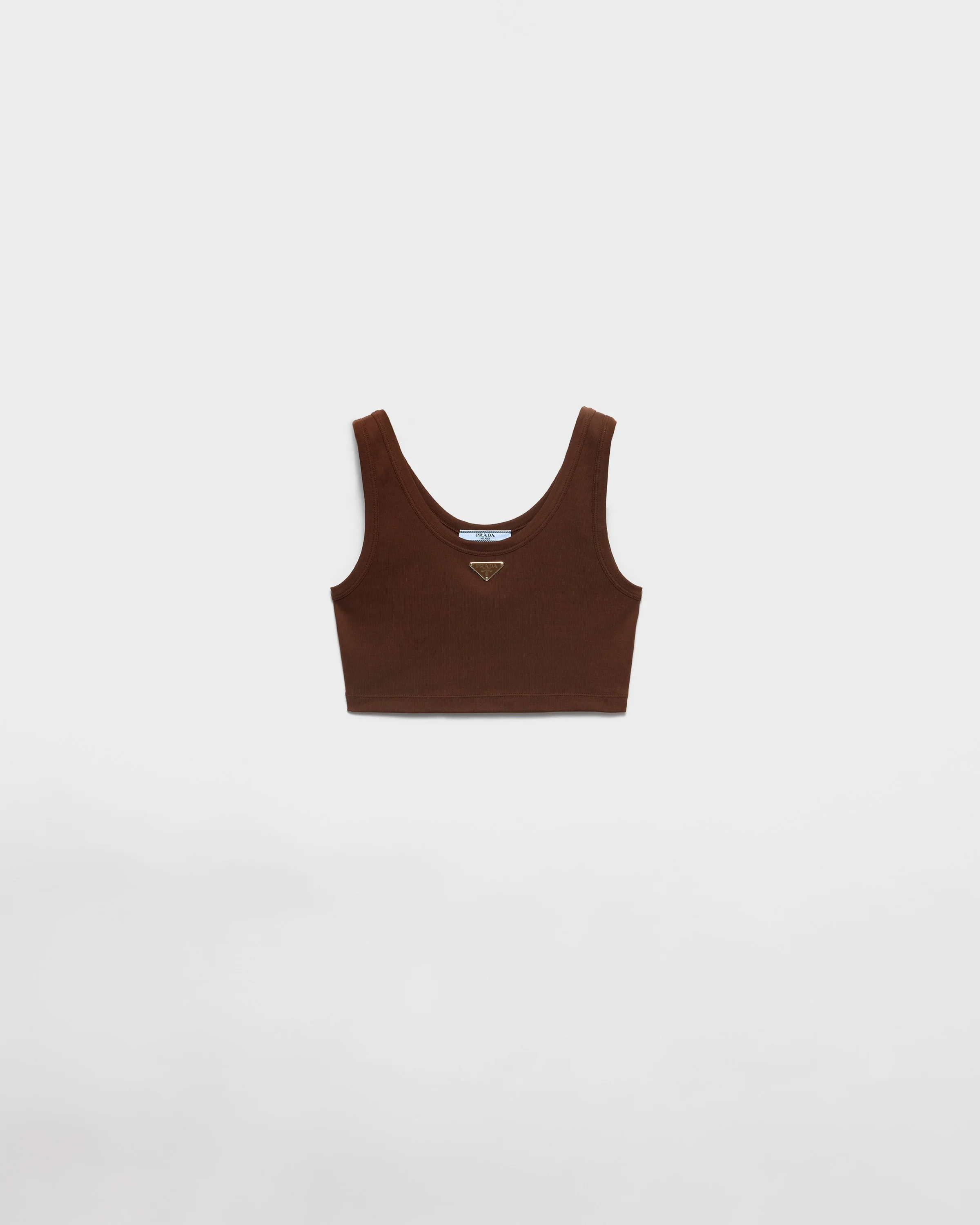 This ribbed cotton top has a slim-fit cropped design. The simple style with scoop neck is embellished with the iconic enameled metal triangle logo. - Product code: 39576_14L0_F0324_S_OOO - Fitted - Scoop neck - Enameled metal triangle logo - Imported - The model is 176 cm tall and wears a size 38 Height: 33cm MATERIALS Main material: 100% cotton