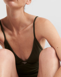 The silhouette of this one-piece swimsuit, reinterpreted with a sleek design, acquires contemporary and sophisticated allure. The style with thin straps is embellished with the iconic enameled metal triangle logo. For sustainable care to preserve the product's characteristics and reduce microfiber shedding, we recommend not washing the item too often. Let the product air out after every use and have it dry cleaned at a specialized ecological dry cleaners. - Product code: 70224_1YW2_F0334_S_OOO - Thin straps - Lined - Enameled metal triangle logo - Imported - The model is 178 cm tall and wears a size 38 MATERIALS Main material: 8% elastane 92% recycled polyamide