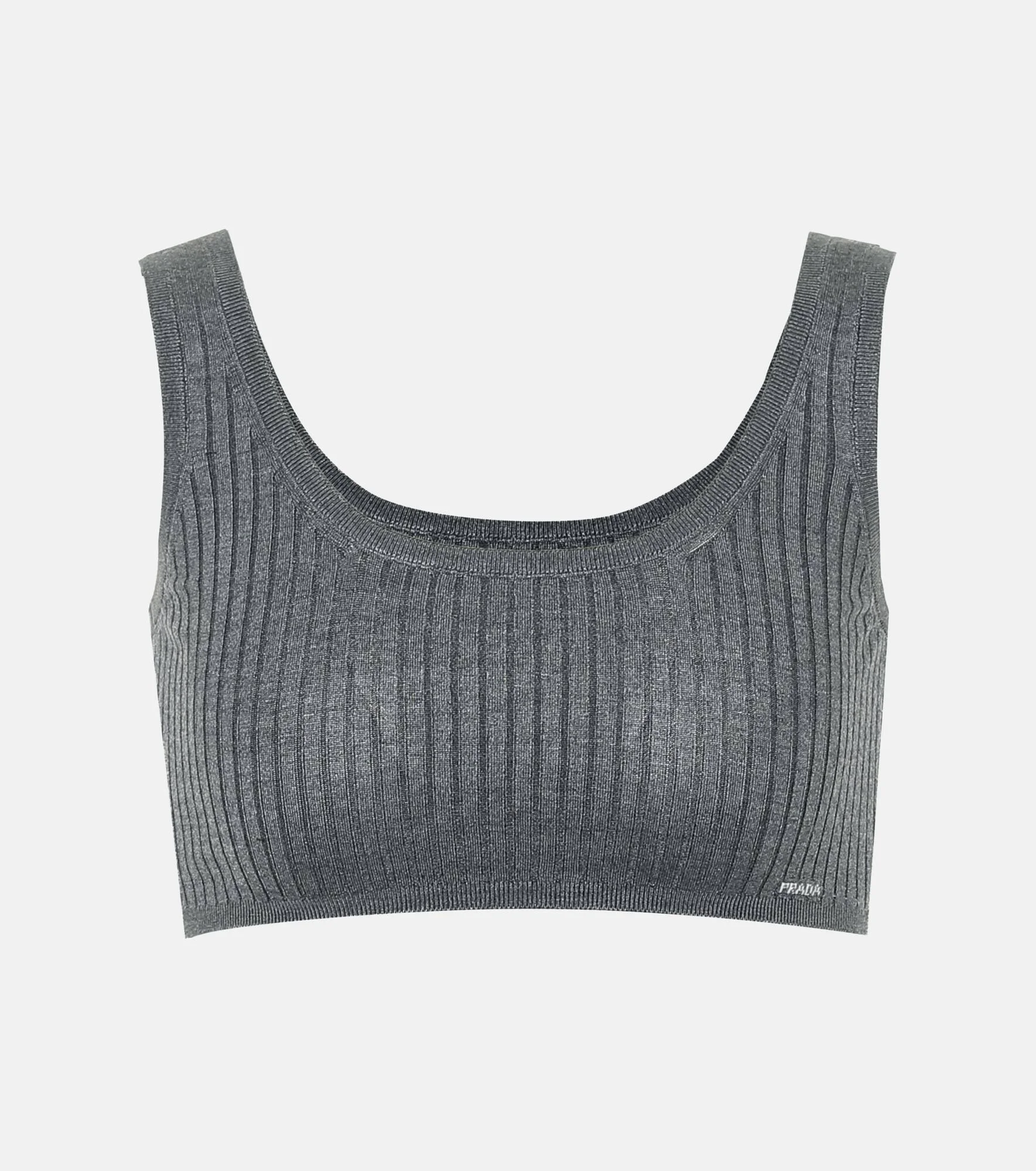Gracing the FW20 runway in a swathe of colors, this ribbed-knit, gray scoop-neck bra from Prada will be a versatile addition to your intimates. Spun from an ultra-soft stretch silk-blend, it's designed for long-lasting comfort. Let yours peep through the lapels of the label's nylon blazers. Product Details - Material: 80% silk, 13% polyamide, 4% elastane, 3% polyester - Care instructions: dry clean - Made in Italy - Designer color name: Dark Grey - Item number: P00513035 Size & Fit - True to size - Fitted - Cropped - The model seen in the picture is 178cm-5'10" and wearing a size IT 40