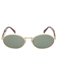 The Prada 65ZS sunglasses are the perfect mix of cutting-edge design and luxury, offering a bold style that stands out. The elegant metal frames come in a chic gold tone, featuring an oval shape and acetate temples. The Prada logo decorates the sunglasses, finely engraved on the metal element to finish the look. - Metal Frame - Tinted Lenses - Oval Shape - Acetate Temple - Engraved Branding