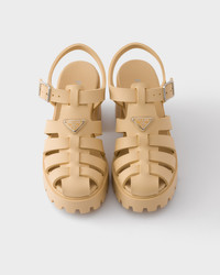 A silhouette with retro charm is reinterpreted in a new and contemporary way in the design of these heeled sandals. The style combines bold volumes with lightweight rubber, becoming an expression of Prada's dual soul. - Product code: 1X267O_3LKK_F0018_F_090 - Upper with metal buckle - Enameled metal triangle logo - Rubber sole - Lug tread - Heel height 90 mm - Leather-covered insole - Imported MATERIALS Main material: Ethyl vinyl acetate - eva