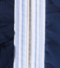 With eye-catching blue stripes and gauzy navy-blue ruffle trims, this dress from Prada exudes everyday chic. The piece has been cut from pure cotton, with its relaxed silhouette cinched by an adjustable waist belt, and it’s finished on a charming note with a pointed collar, zipped front, and a pleated skirt. Wear yours with loafers by day and vertiginous sandals by night. Product Details - Insert: 100% silk - Belt loops - Designer color name: Blue - Detachable belt - Made in Italy - Buttoned cuffs - Closure: zipped front - Material: 100% cotton - Item number: P00363923 Size & Fit - True to size - Loose fit, comes with belt - The model seen in the picture is 178cm-5'10" and wearing a size IT 40