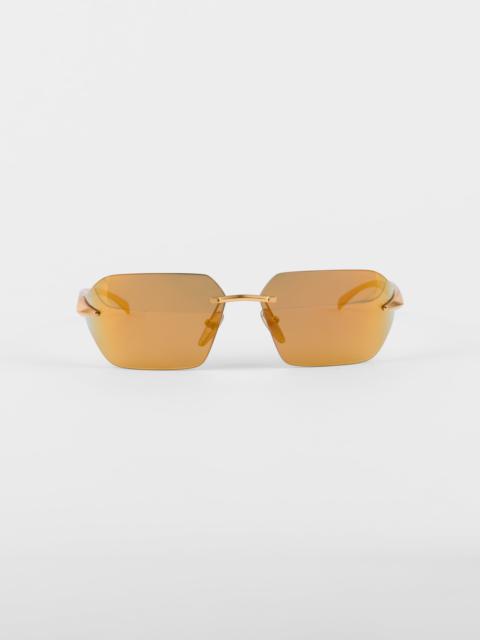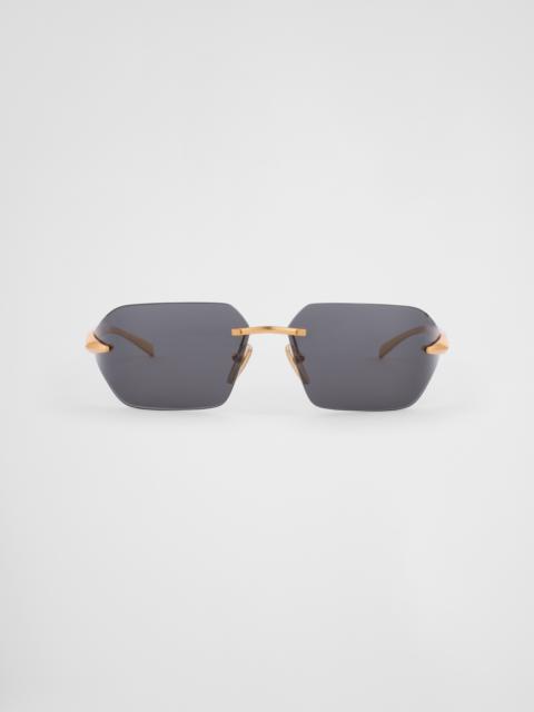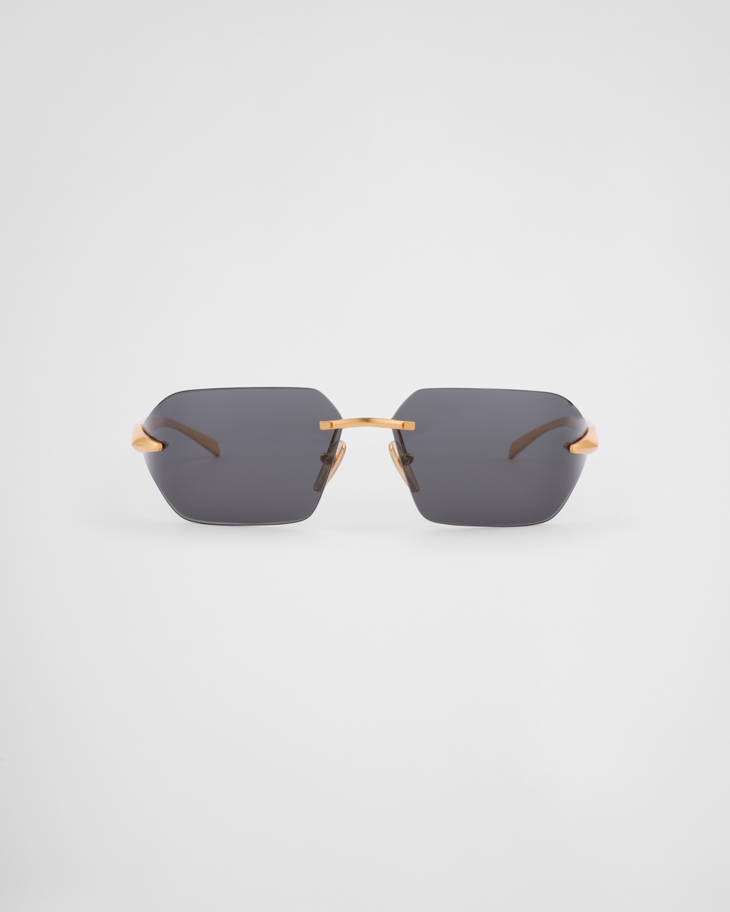Sunglasses with a slightly curved, ultra-light metal frame. The front has rimless lenses with a distinct curvature on the side and is combined with temples embellished with a faceted triangle on the front. The Prada lettering logo is engraved tone on tone. - Product code: SPRA56_E15N_F05S0_C_071 - Metal frame front - Color: Satin-finish Yellow Gold - Frame not compatible with graduated lenses - 100% UVA / UVB protection - Adjustable nose pads suitable for any fit - Lens-nose-temple measurement: 71-14-115 mm - Article comes with dedicated packaging - Other available colors - Imported MATERIALS Metal