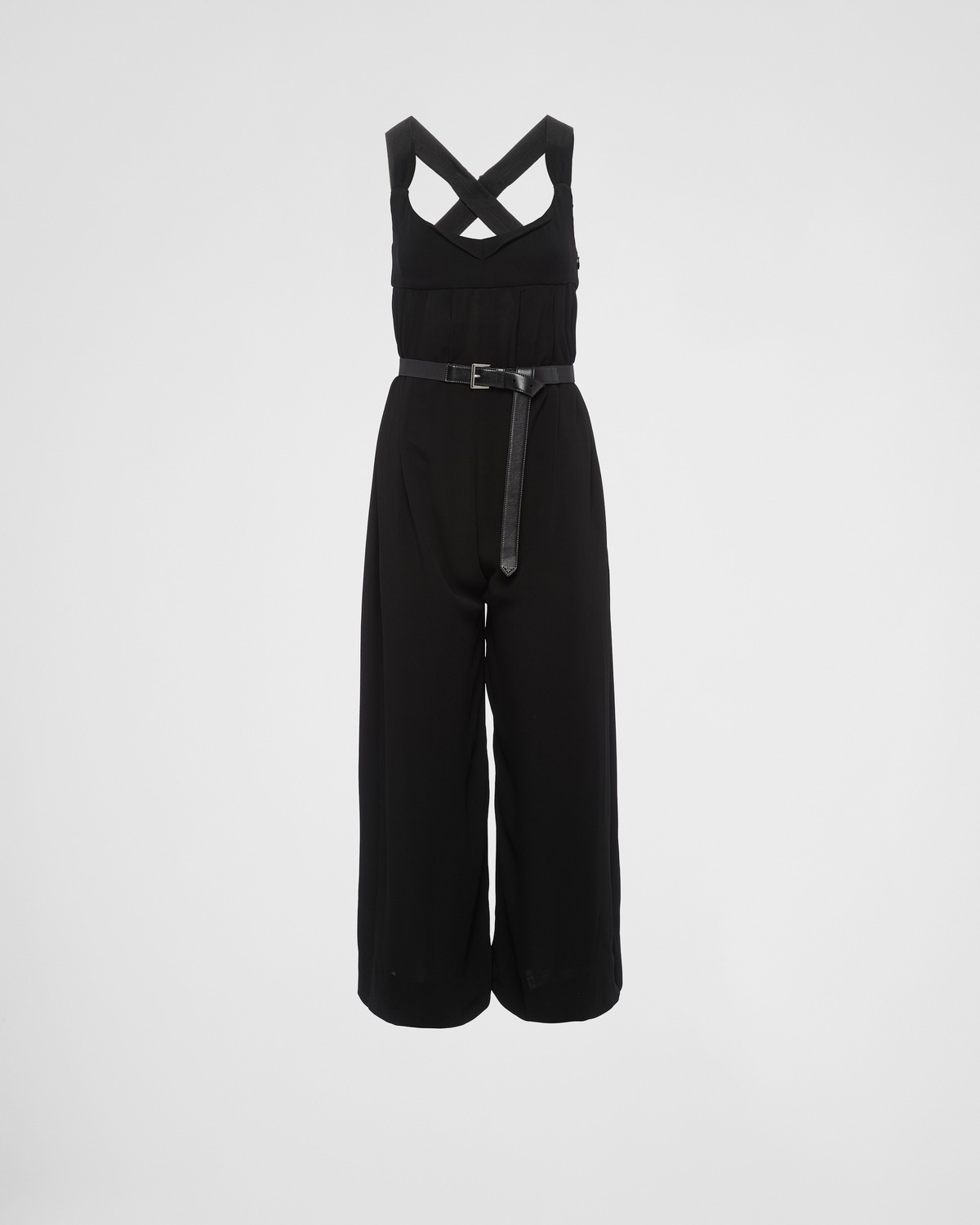 This sablé jumpsuit with a forties mood features a refined, feminine design enhanced by the plunging neckline. The enameled metal triangle logo stands out on the wide shoulder straps that cross on the back. - Product code: P290GT_12JK_F0002_S_231 - Jumpsuit fit - Plunging V-neck - Side zipper closure - Sleeveless - Inseam pockets - Three-dimensional fabric triangle logo - Height: 100cm MATERIALS Viscose
