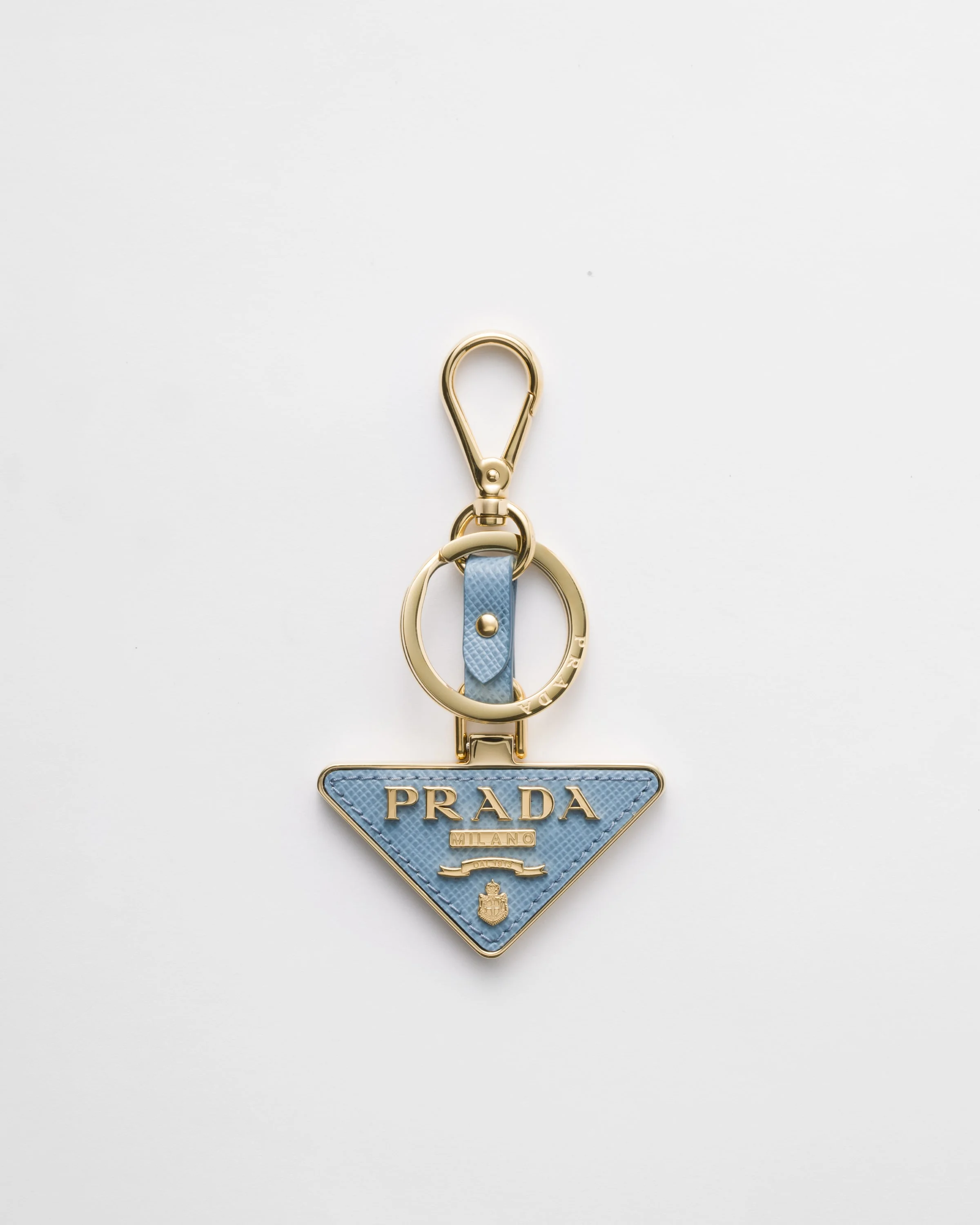 This Saffiano leather keychain has metal details and is shaped like the iconic Prada triangle logo. - Product code: 1PP128_053_F0637 - With snap-hook and ring - Metal lettering logo - Imported MATERIALS Main material: Calfskin
