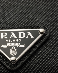 Elegant Saffiano leather badge holder with metal hardware and detachable strap. - Product code: 1MC007_QHH_F0632 - Enameled metal triangle logo - Two card slots - Moire lining - Detachable, Saffiano leather neck strap - Imported Height: 10.5cm Width: 7cm MATERIALS Main material: Calfskin