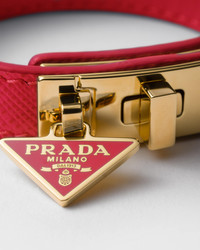This elegant Saffiano leather bracelet embellished with a triangle logo charm stands out for its sophisticated, feminine design. - Product code: 1IB572_053_F068Z - Turn-lock clasp - Logo-engraved charm - Imported Height: 1.2cm MATERIALS Leather