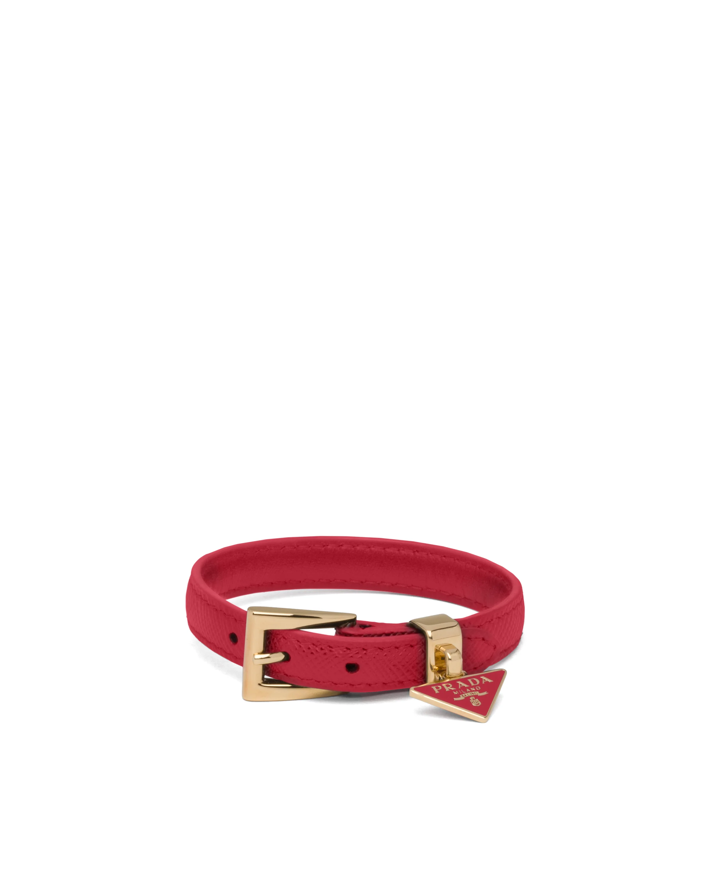 This elegant Saffiano leather bracelet decorated with a metal triangle logo charm stands out for its feminine design. - Product code: 1IB351_053_F068Z - Metal buckle closure - Logo loop with enameled metal triangle charm - Imported Height: 1cm Width: 1cm MATERIALS Main material: Calfskin