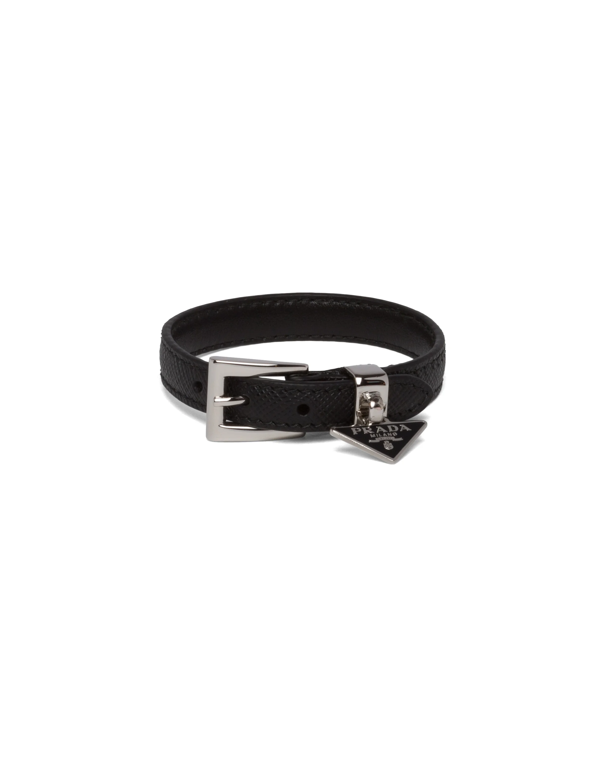 This elegant Saffiano leather bracelet decorated with a metal triangle logo charm stands out for its feminine design. - Product code: 1IB351_053_F0632 - Metal buckle closure - Logo loop with enameled metal triangle charm - Imported Height: 1cm Width: 1cm MATERIALS Main material: Calfskin