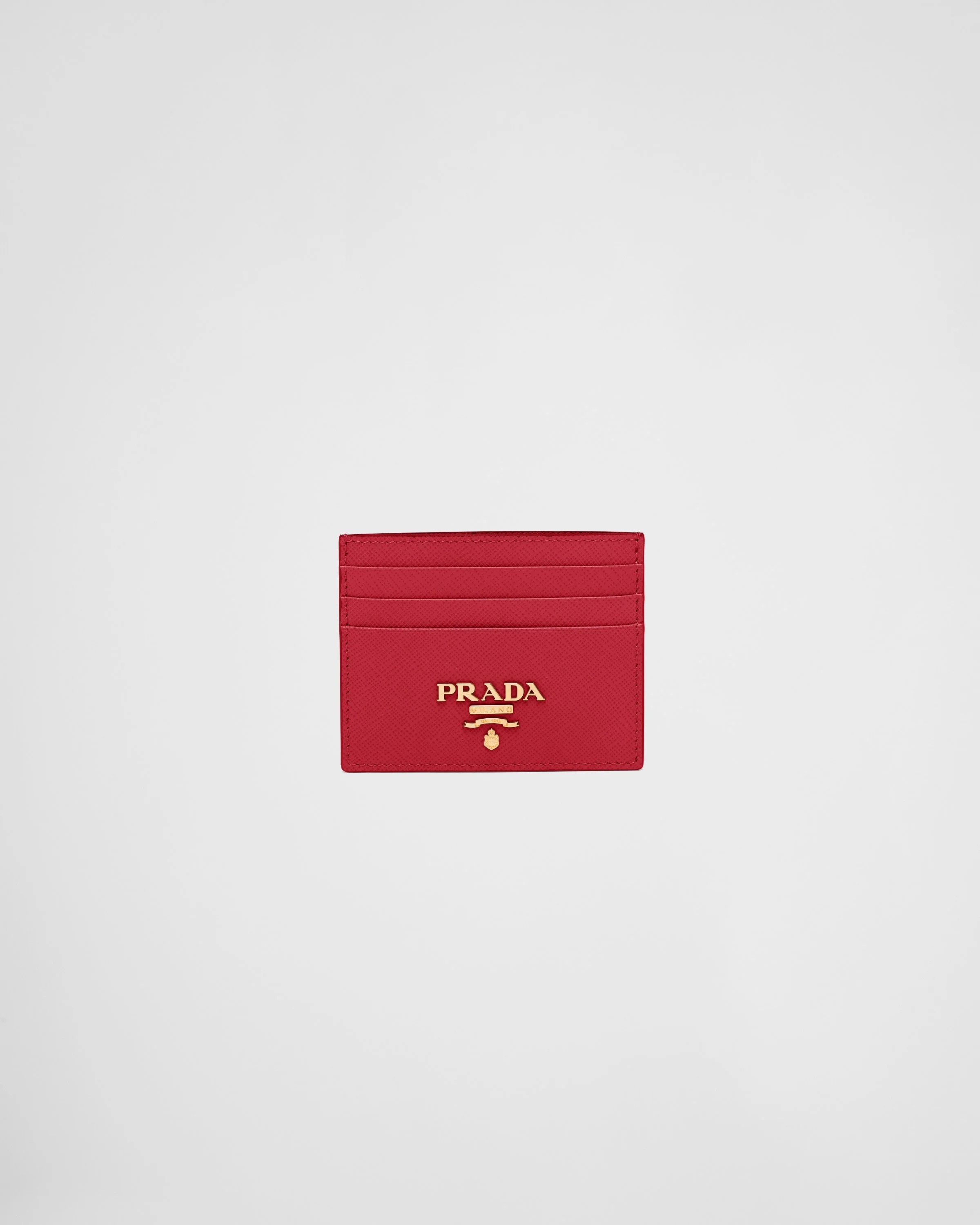 This Saffiano leather card holder expresses elegant simplicity. It is decorated with the metal logo. - Product code: 1MC025_QWA_F068Z - Metal lettering logo - Six card slots - One inside pocket - Moire and Saffiano leather lining - Imported Height: 8cm Width: 10cm MATERIALS Main material: Calfskin