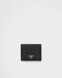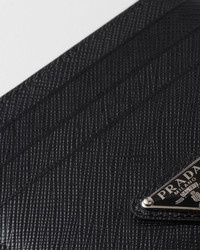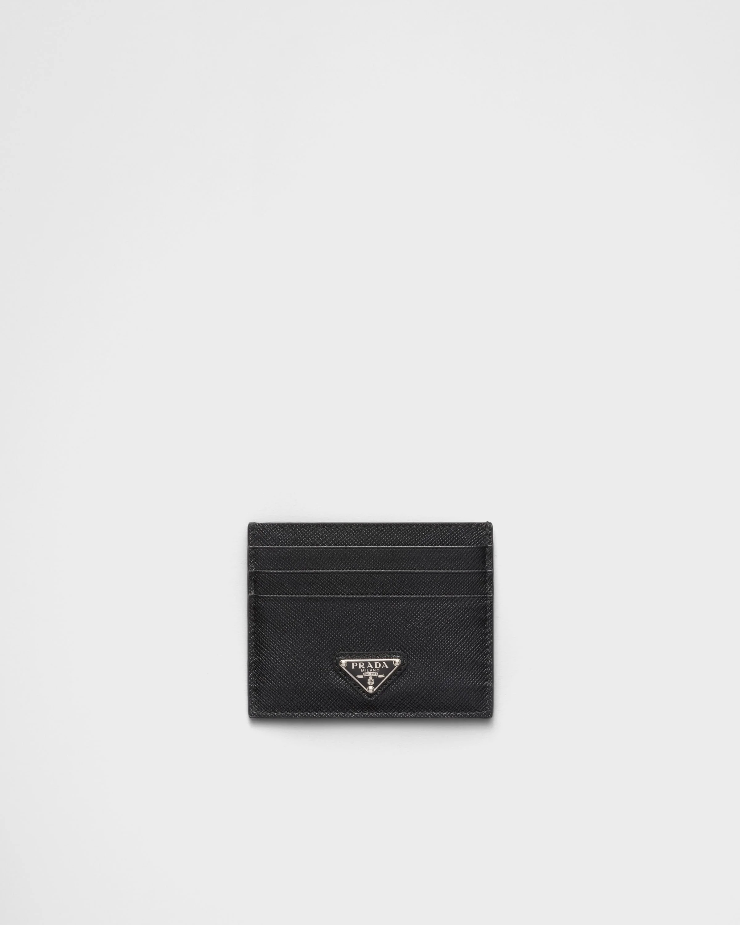 The unmistakable texture of Saffiano leather characterizes this sleek card holder. The accessory with six card slots is decorated with a tonal enameled metal triangle logo. - Product code: 1MC025_QHH_F0632 - Enameled metal triangle logo - Six card slots - One inside pocket - Moire and Saffiano leather lining - Imported Height: 8cm Width: 10cm MATERIALS Main material: Calfskin