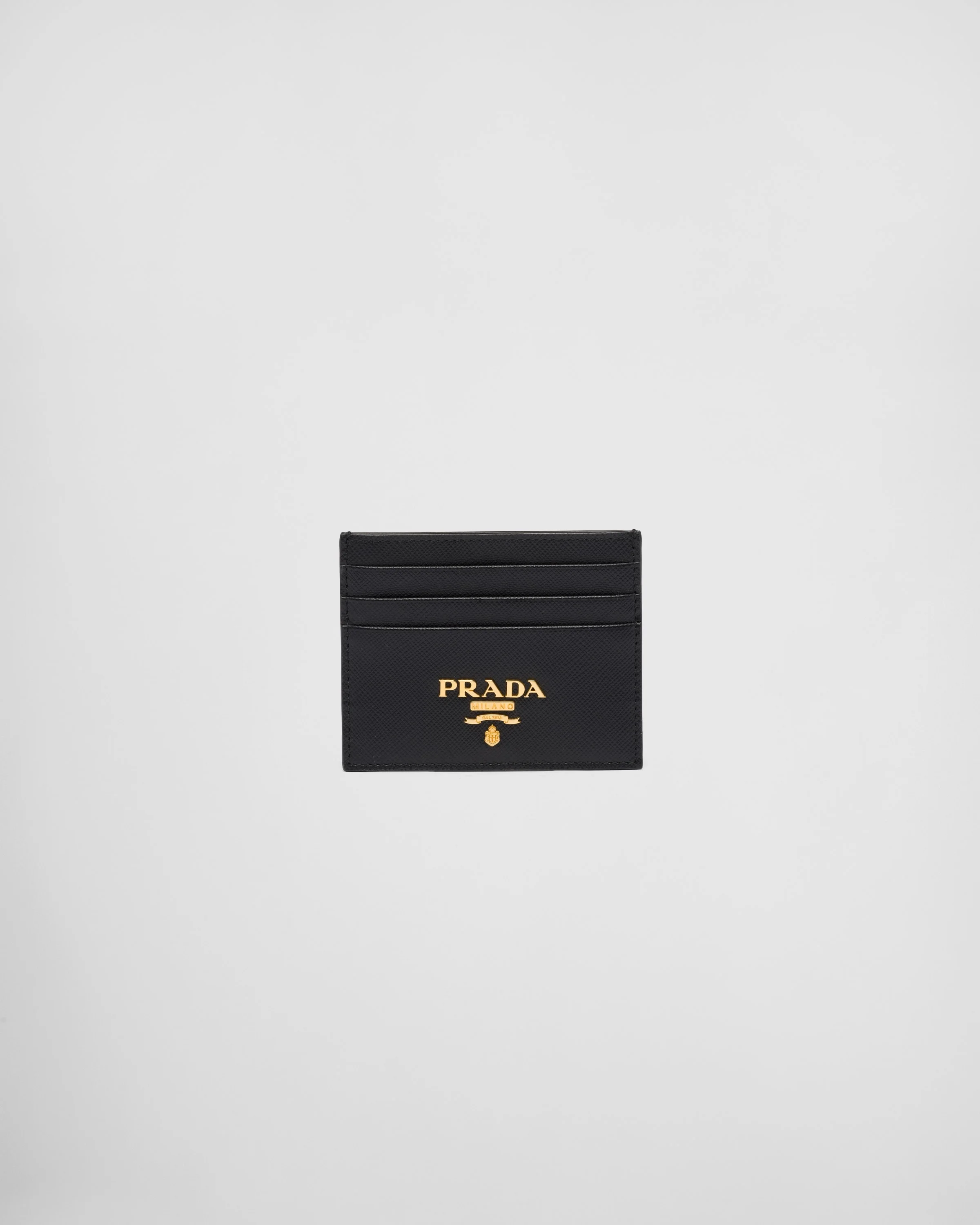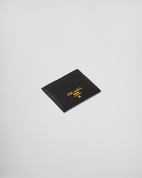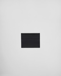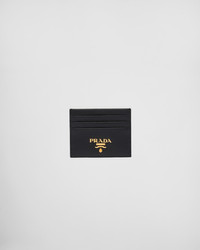 This Saffiano leather card holder expresses elegant simplicity. It is decorated with the metal logo. - Product code: 1MC025_QWA_F0002 - Metal lettering logo - Six card slots - One inside pocket - Moire and Saffiano leather lining - Imported Height: 8cm Width: 10cm MATERIALS Main material: Calfskin
