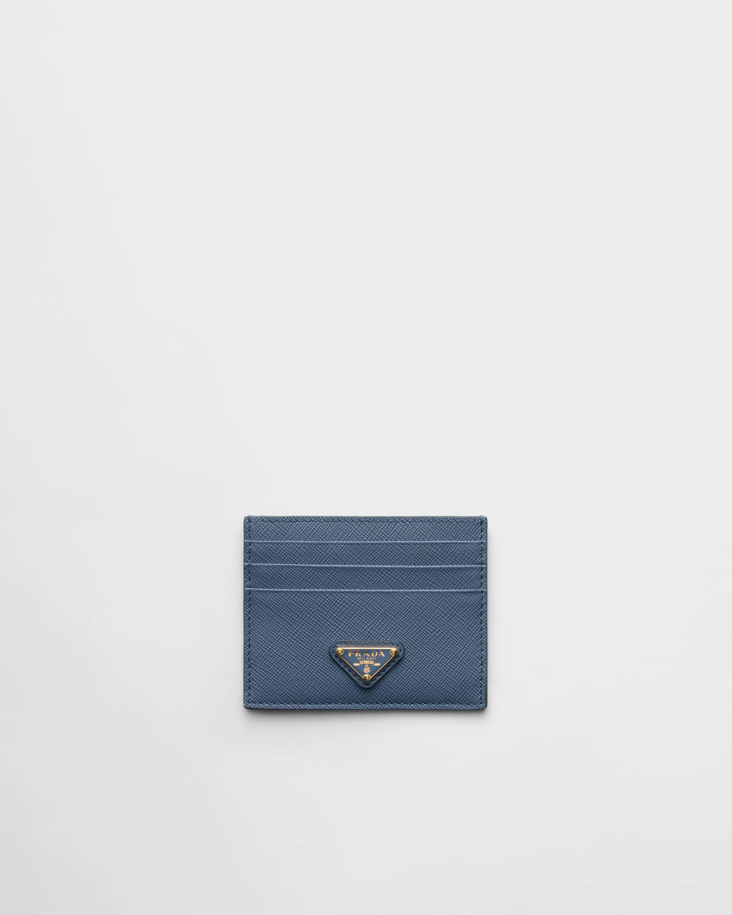 The unmistakable texture of Saffiano leather characterizes this sleek card holder. The accessory with six card slots is decorated with a tonal enameled metal triangle logo. - Product code: 1MC025_QHH_F0D57 - Enameled metal triangle logo - Six card slots - One inside pocket - Moire and Saffiano leather lining - Imported Height: 8cm Width: 10cm MATERIALS Main material: Calfskin