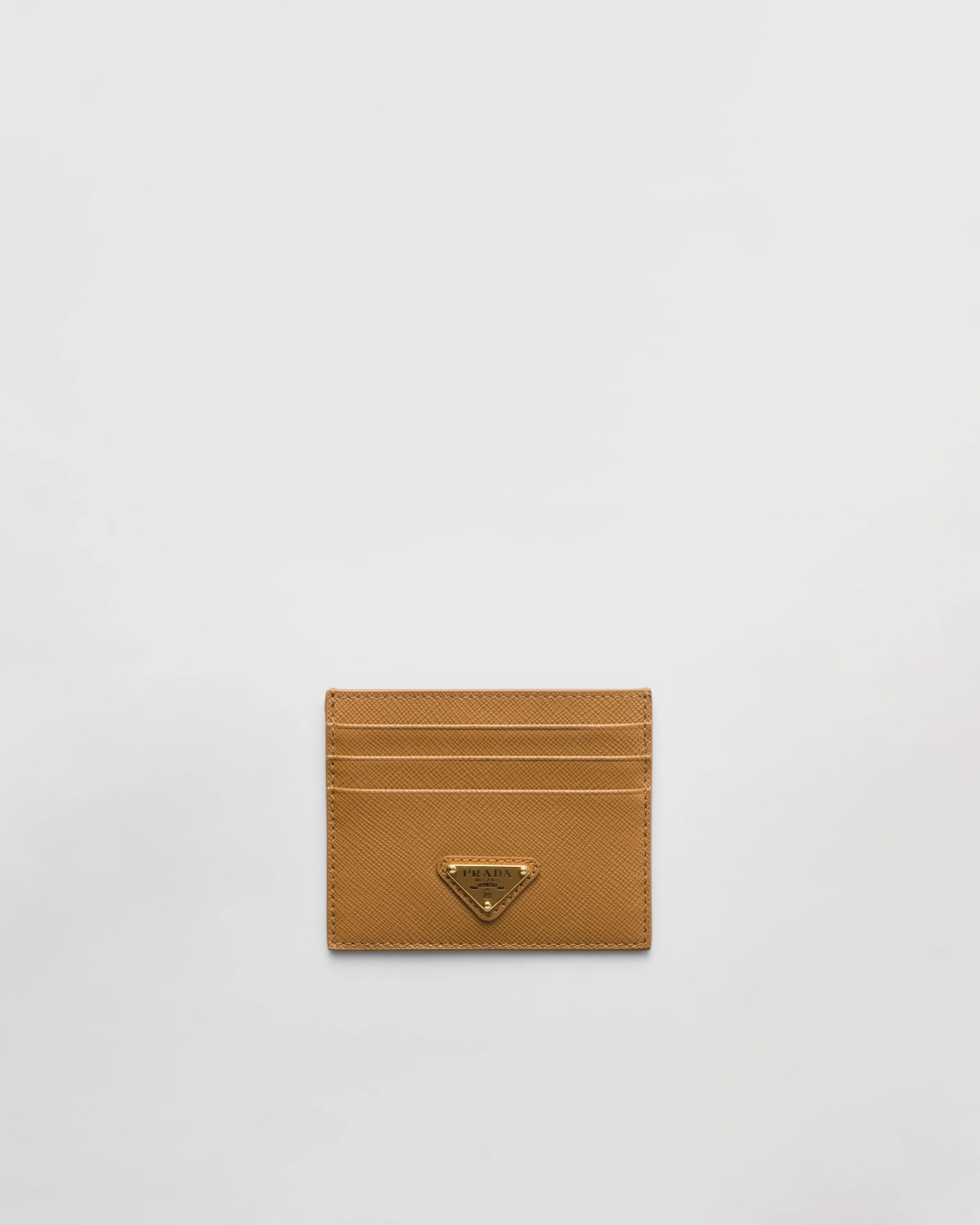 The unmistakable texture of Saffiano leather characterizes this sleek card holder. The accessory with six card slots is decorated with a tonal enameled metal triangle logo. - Product code: 1MC025_QHH_F03BH - Enameled metal triangle logo - Six card slots - One inside pocket - Moire and Saffiano leather lining - Imported Height: 8cm Width: 10cm MATERIALS Main material: Calfskin