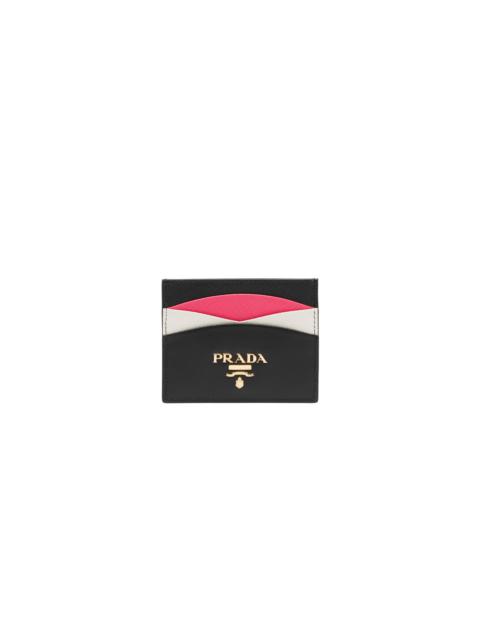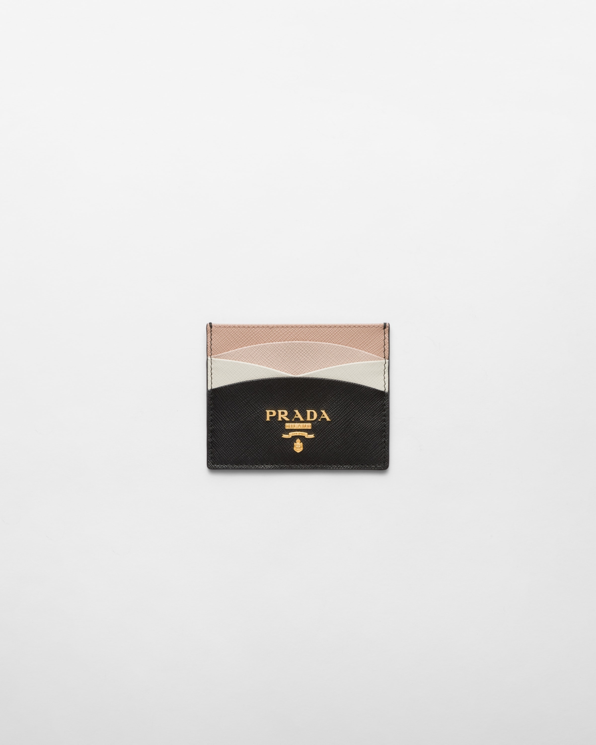A sophisticated design with curved lines defines the multicolored Saffiano leather credit card holder. Practicality is ensured by the fabric-lined center pocket and card slots. - Product code: 1MC025_ZLP_F0G28 - Multicolored Saffiano leather lining - Metal lettering logo - Six card slots - One inside pocket - Moire and Saffiano leather lining - Imported Height: 8cm Width: 10cm MATERIALS Leather
