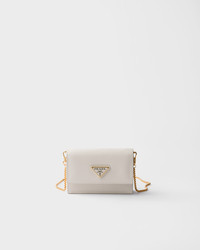 This sophisticated and versatile card holder with flap has a removable chain shoulder strap that adds a luxurious touch and allows it to be worn in different ways. The metal lettering logo decorates the front of this accessory made of Saffiano leather, the iconic material of the brand defined by its crosshatch texture and waxed finish. - Product code: 1MR034_QHH_F0K74 - Snap closure - Enameled metal triangle logo - Two card slots - Moire and Saffiano lining - Removable chain shoulder strap - Imported Height: 8cm Width: 11.5cm Length: 2.5cm MATERIALS Main material: Calfskin