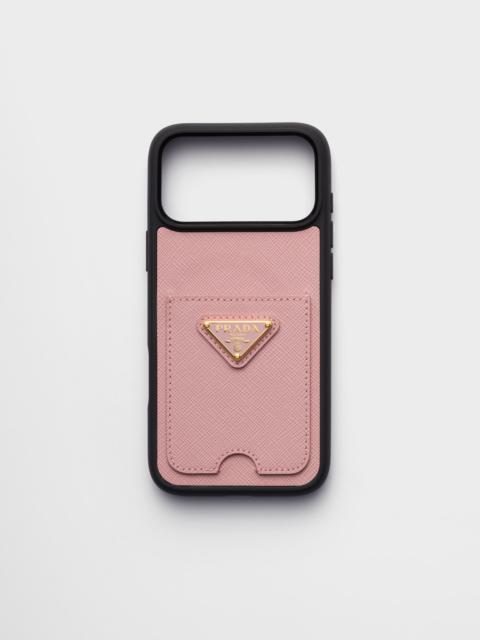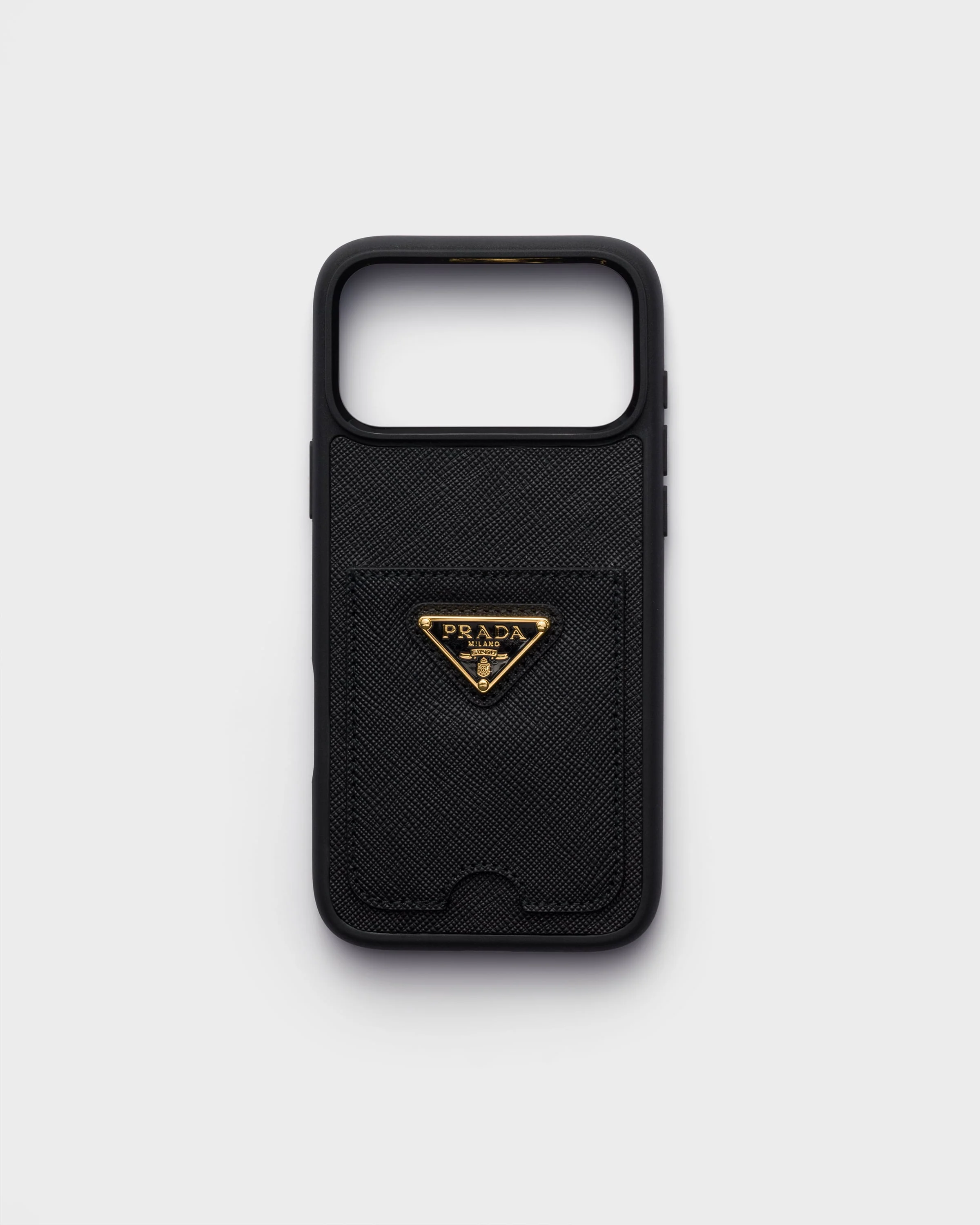 Combining elegance and functionality, this Saffiano leather case for the iPhone 17 Pro Max is characterized by a card holder pocket decorated with the enameled metal triangle logo. - Product code: 1ZH222_2CKR_F0002 - With card slots - Enameled metal triangle logo - Imported MATERIALS Main material: Calfskin
