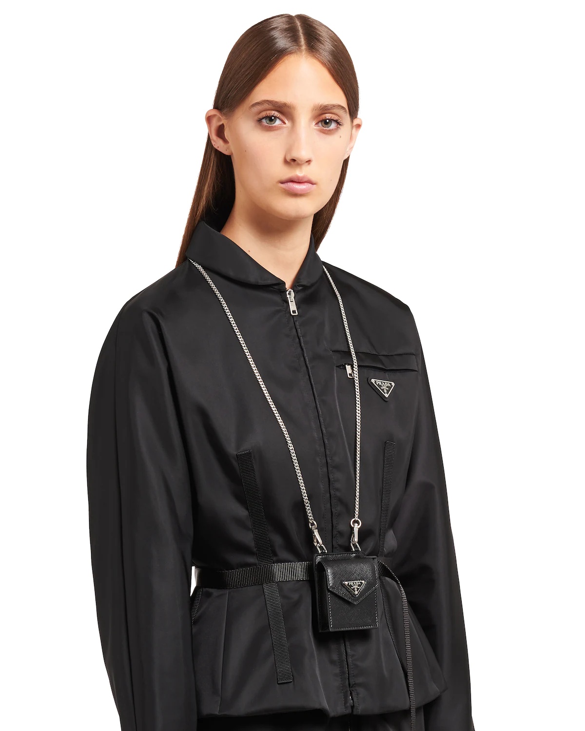The metal triangle logo decorates this Saffiano leather earphone case with neck strap. - Product code: 1TL403_QHH_F0632 - Snap fastener - Enameled metal triangle logo - Chain neck strap - Height: 8.5cm - Width: 6.5cm MATERIALS Leather