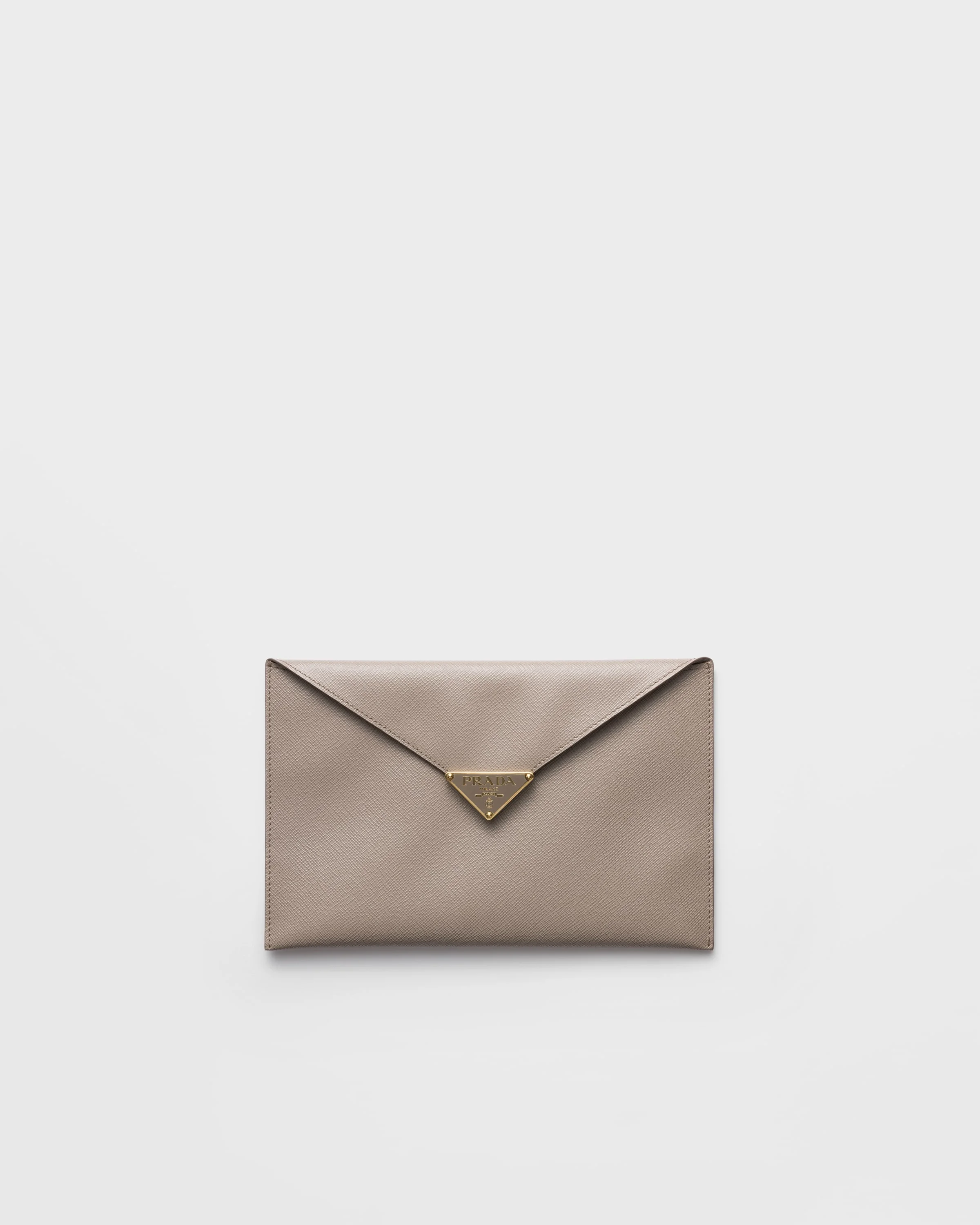 This sophisticated and functional envelope clutch in Saffiano leather has a sleek design. The accessory with card slots is decorated with the enameled metal triangle logo. - Product code: 1MF048_2CLQ_F0572 - Snap closure - Enameled metal triangle logo - Three card slots - Leather lining - Imported Height: 15cm Width: 23cm MATERIALS Main material: Calfskin