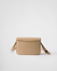 This shoulder bag plays with the concept of simplicity in its lines and compact size, combining versatility and elegance in a refined design. The bag made of Saffiano leather comes with an adjustable shoulder strap enriched with metal hardware, like the iconic triangle logo embellishing the clasp. - Product code: 1BD320_2A4A_F0036_V_YTO - Adjustable leather shoulder strap. Maximum length 116 cm - Minimum length 104 cm - Maximum drop 55 cm - Minimum drop 45 cm - Back pocket - Metal hardware - Enameled metal triangle logo on clasp - Flap closure with logoed push-lock clasp - Logo-print nylon lining with patch pocket - Imported Height: 15cm Width: 22cm Length: 6cm MATERIALS Main material: Calfskin